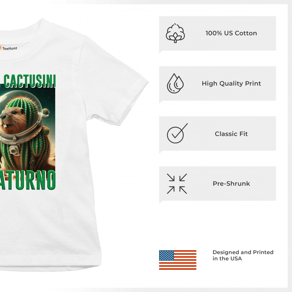 Blast off with Bobrini Cactusini Su Saturno—a cactus-beaver astronaut floating in pure brainrot. This cursed design blends space meme aesthetics, weirdcore fashion, viral Gen Z humor, and surreal animal mashups. It’s the ultimate tee for lovers of ironic internet chaos and absurdist TikTok trends.