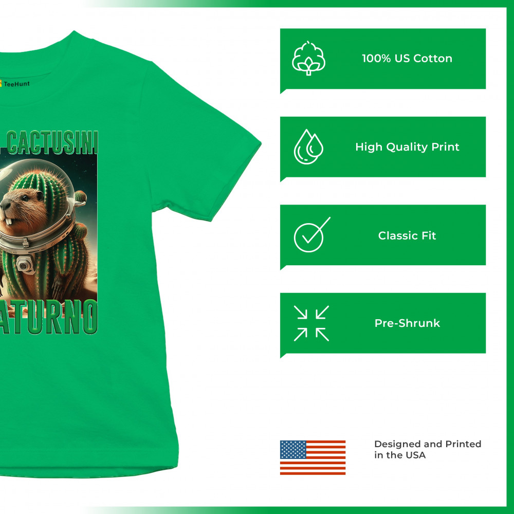 Blast off with Bobrini Cactusini Su Saturno—a cactus-beaver astronaut floating in pure brainrot. This cursed design blends space meme aesthetics, weirdcore fashion, viral Gen Z humor, and surreal animal mashups. It’s the ultimate tee for lovers of ironic internet chaos and absurdist TikTok trends.