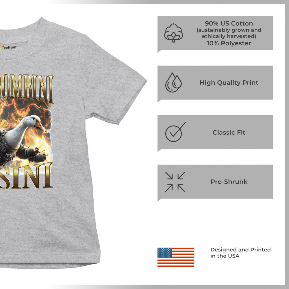 Bombombini Gusini is meme chaos at Mach speed. Featuring a mechanized goose powered by pure Italian Brainrot energy, this design blends cursed-core humor, Gen Z absurdity, ironic fashion, and weirdcore visuals. Perfect for animal meme fans, TikTok-core addicts, and anyone whose humor is completely unhinged.