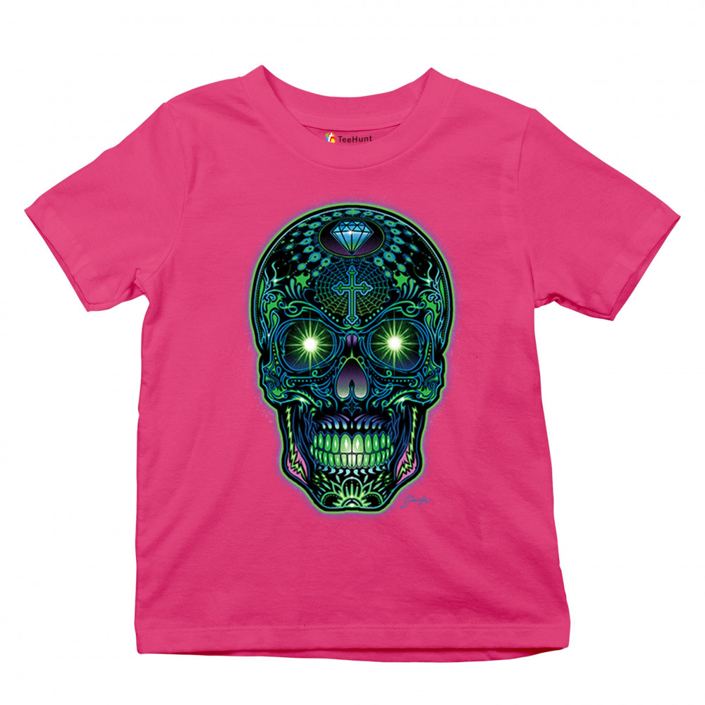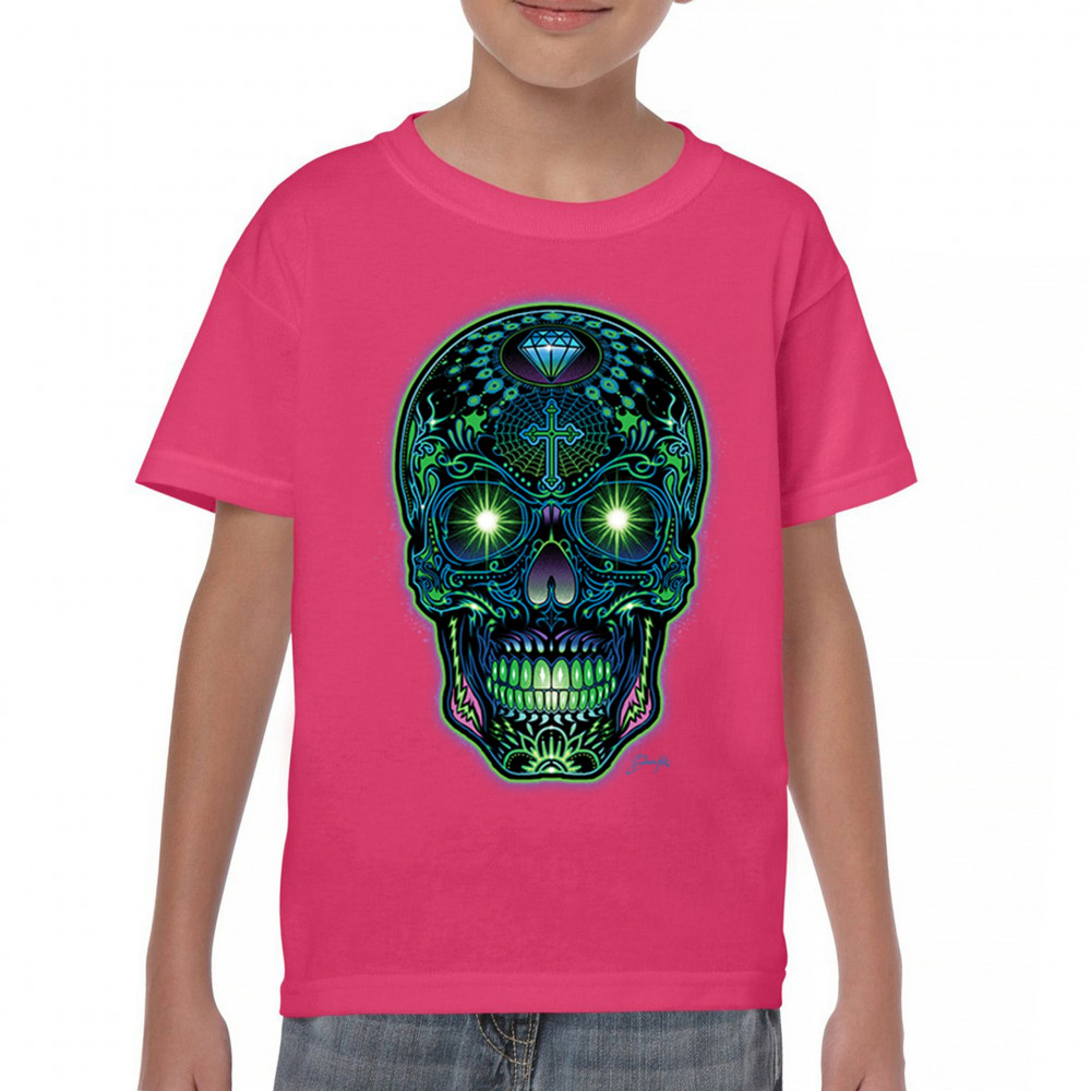 This electrified sugar skull design glows with neon energy and intricate details. Featuring green eyes, radiant cross, diamond, spider web, and vivid colors, it's a bold mash-up of psychedelic art, Day of the Dead tradition, and rave culture. A vibrant design perfect for skull fans and spiritual rebels alike.