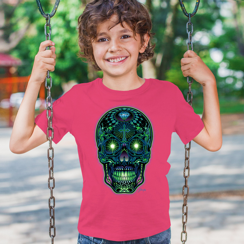 Electrified sugar skull with glowing green eyes, neon cross and diamond, perfect for rave lovers, skull art fans, and Day of the Dead style.