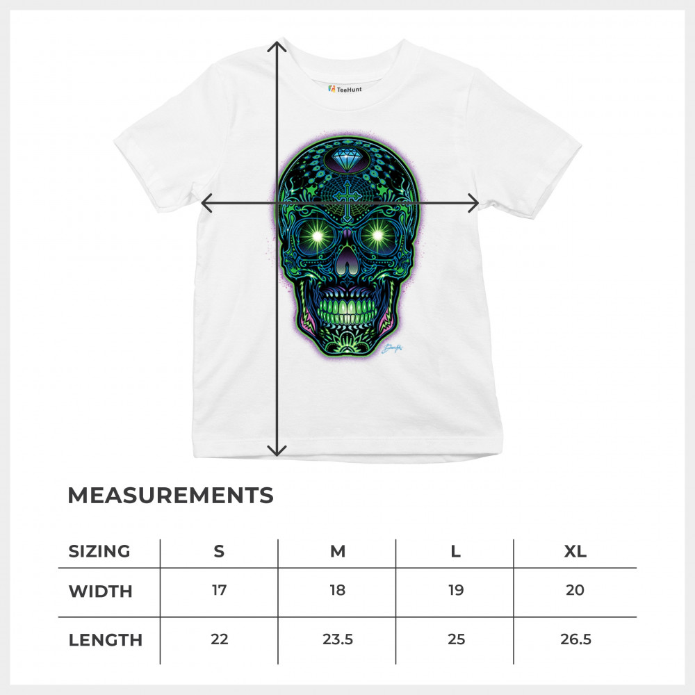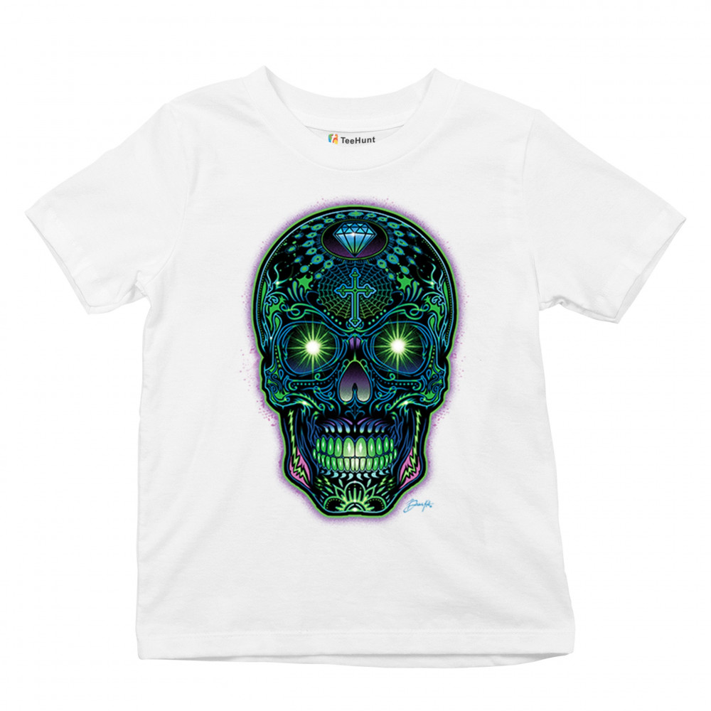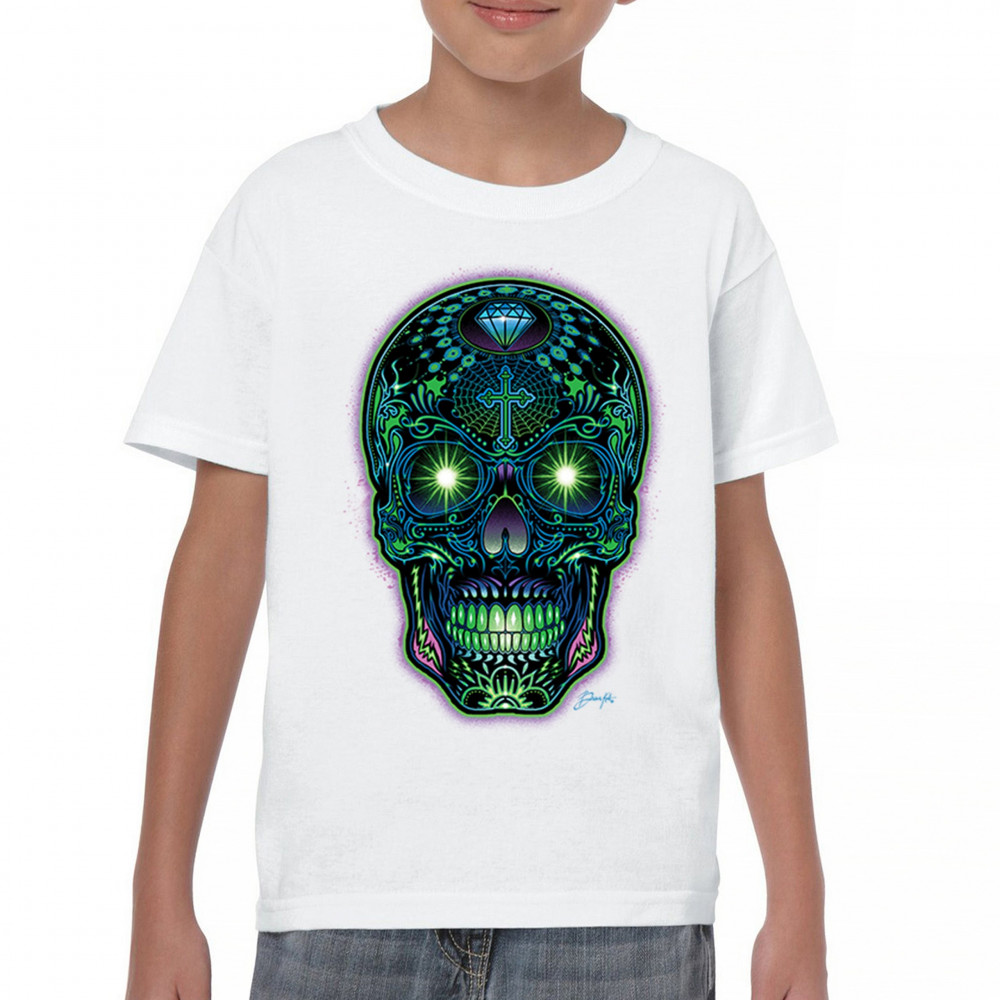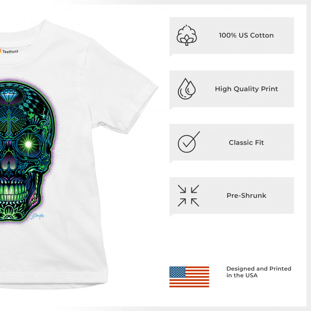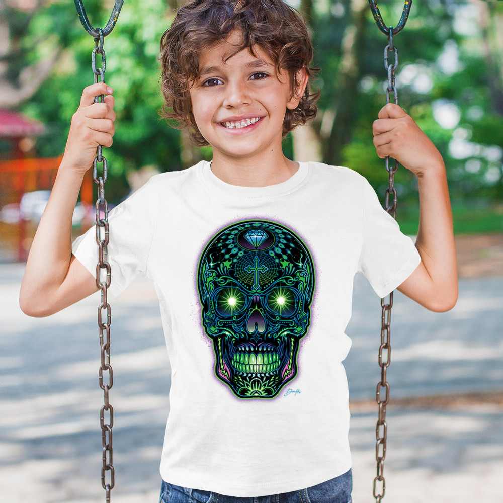 This electrified sugar skull design glows with neon energy and intricate details. Featuring green eyes, radiant cross, diamond, spider web, and vivid colors, it's a bold mash-up of psychedelic art, Day of the Dead tradition, and rave culture. A vibrant design perfect for skull fans and spiritual rebels alike.