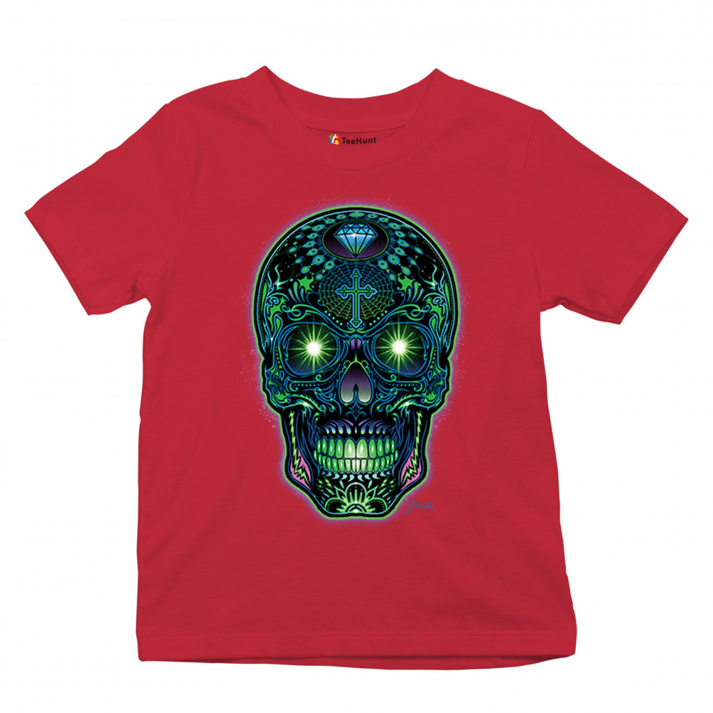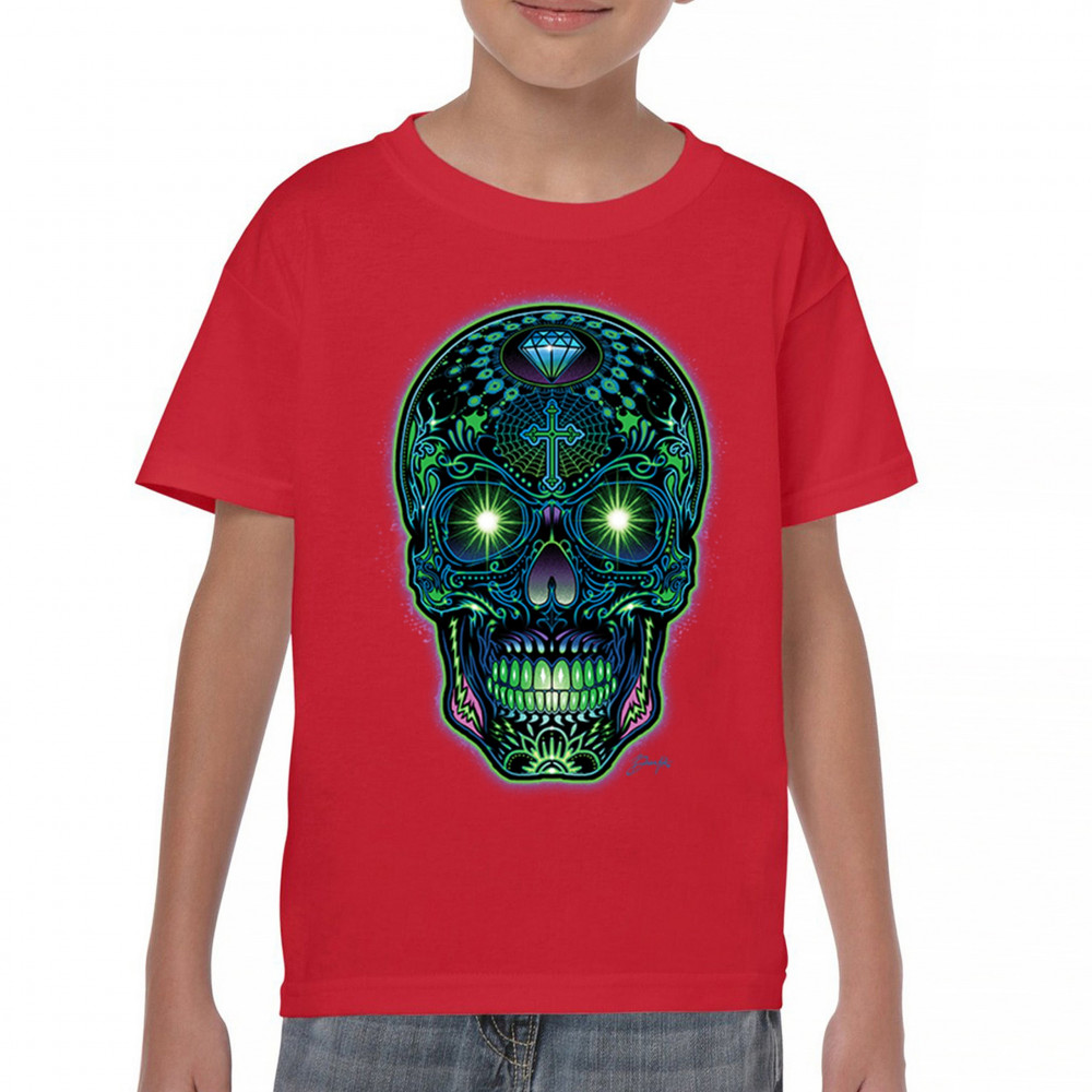 This electrified sugar skull design glows with neon energy and intricate details. Featuring green eyes, radiant cross, diamond, spider web, and vivid colors, it's a bold mash-up of psychedelic art, Day of the Dead tradition, and rave culture. A vibrant design perfect for skull fans and spiritual rebels alike.