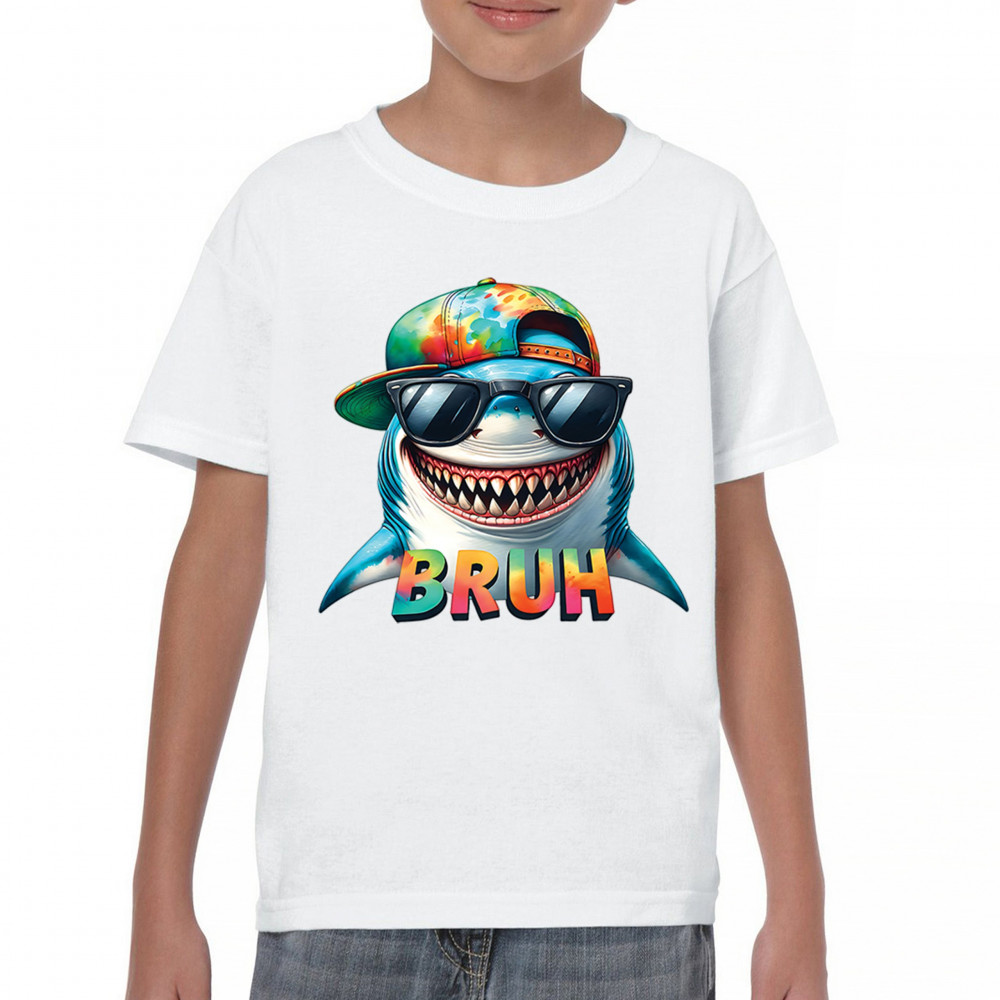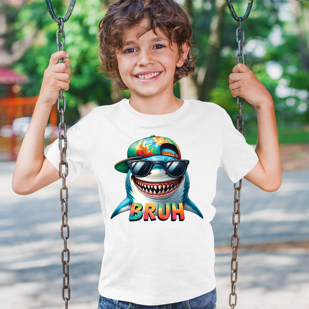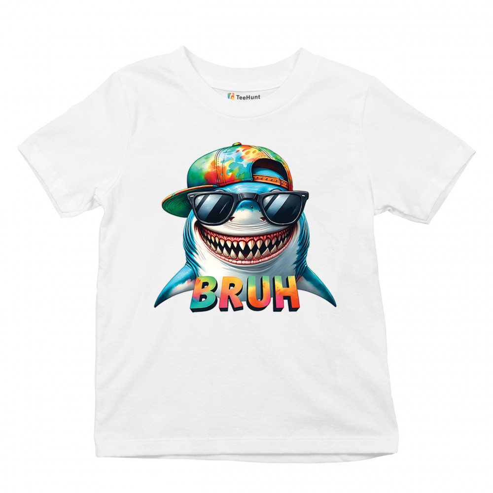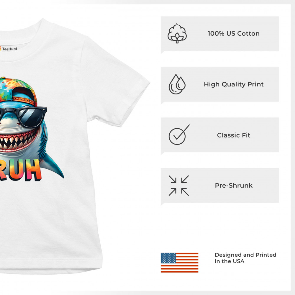 Bruh Shark meme shirt with Gen Z humor, cartoon shark design, summer beach vibes, Sigma Aura, and Italian Brainrot internet humor.
