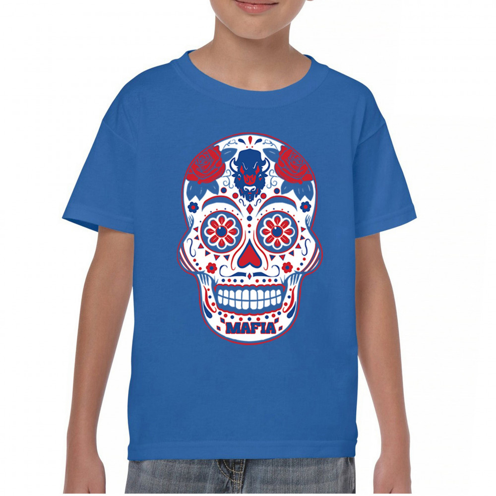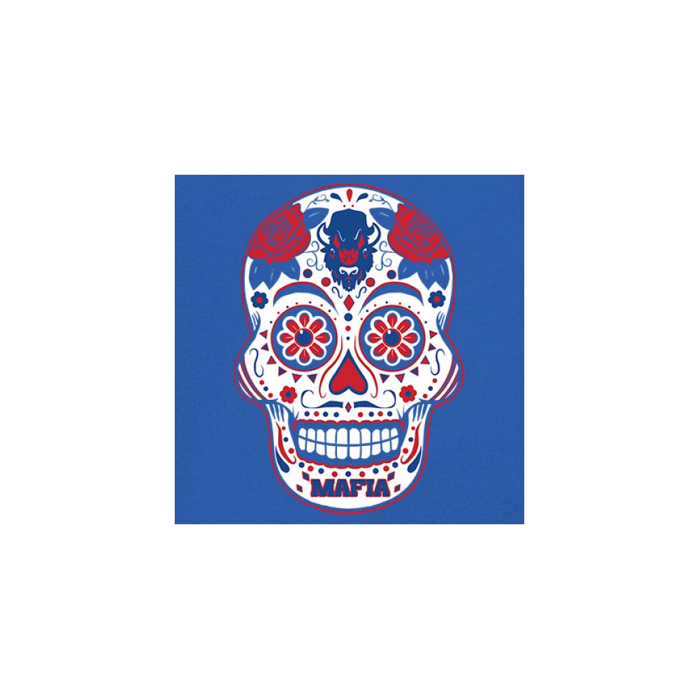 Buffalo Sugar Skull with NY Bleed Blue pride, Northern Grit, Queen City football, playoff energy, and fantasy fan culture.