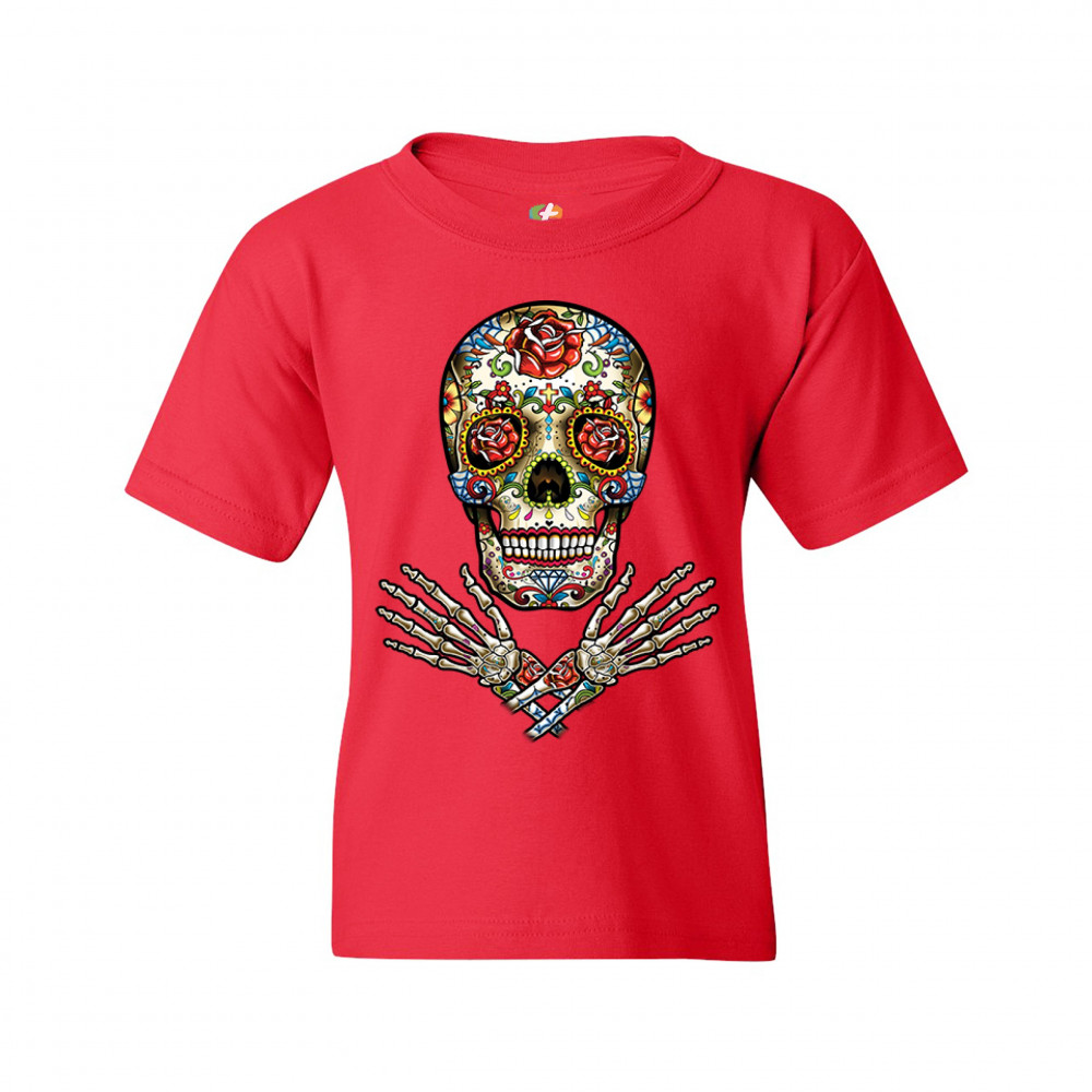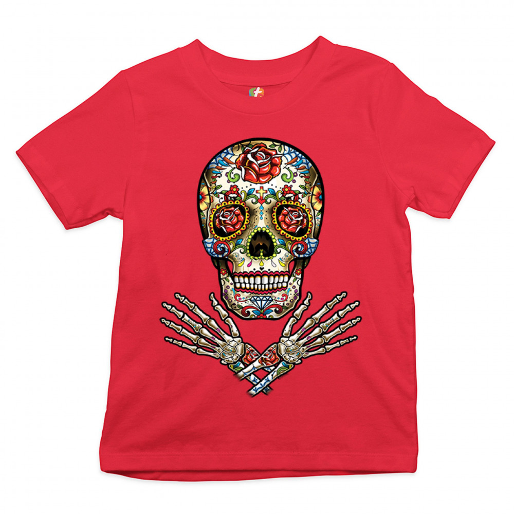 A huge print featuring a big calavera with roses in the eye sockets. There is a cross between the eyes and a huge rose on the forehead. Below the skull there are crossed arms. A great choice for anyone who upholds the traditions and celebrates the Day of