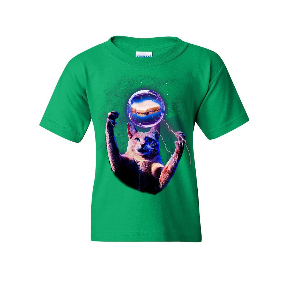 CAT CATCHING A PB&J cat catching a sandwich youth t-shirt plasma ball kitty kitten weird kids tee green