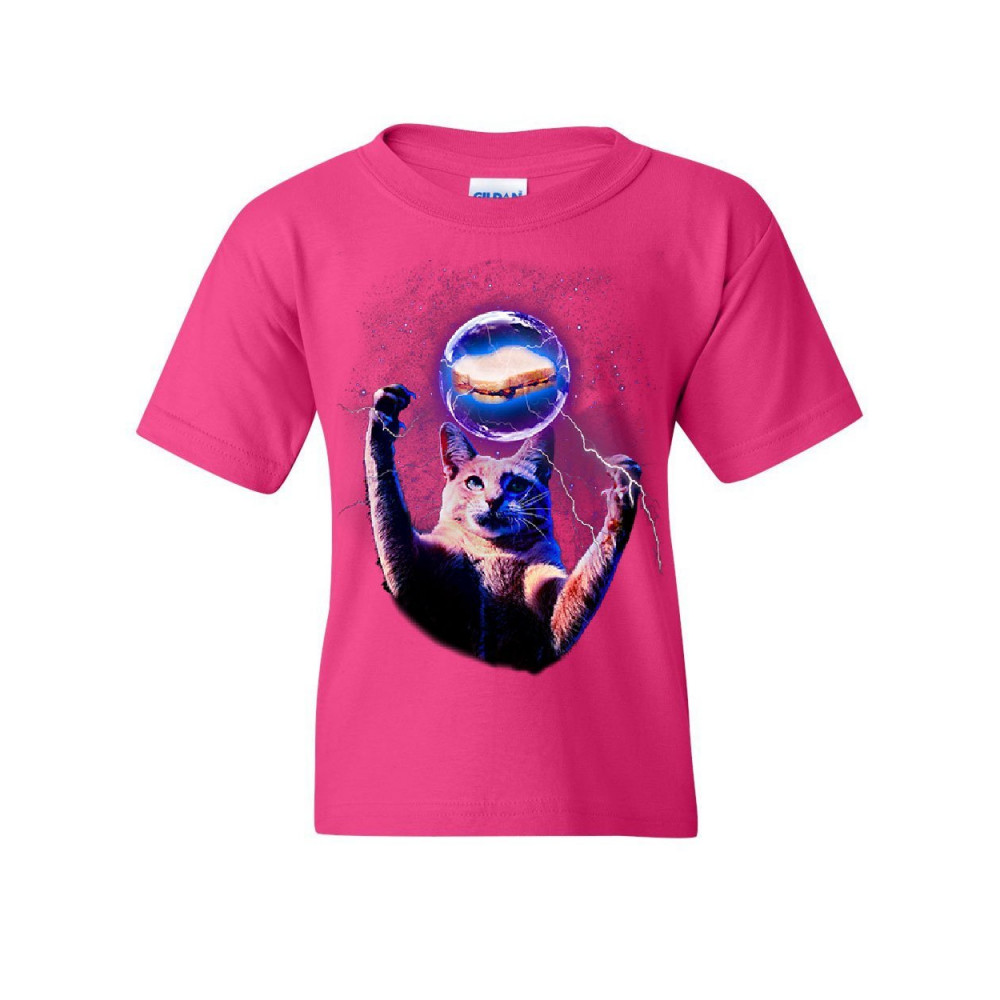 CAT CATCHING A PB&J cat catching a sandwich youth t-shirt plasma ball kitty kitten weird kids tee hot pink