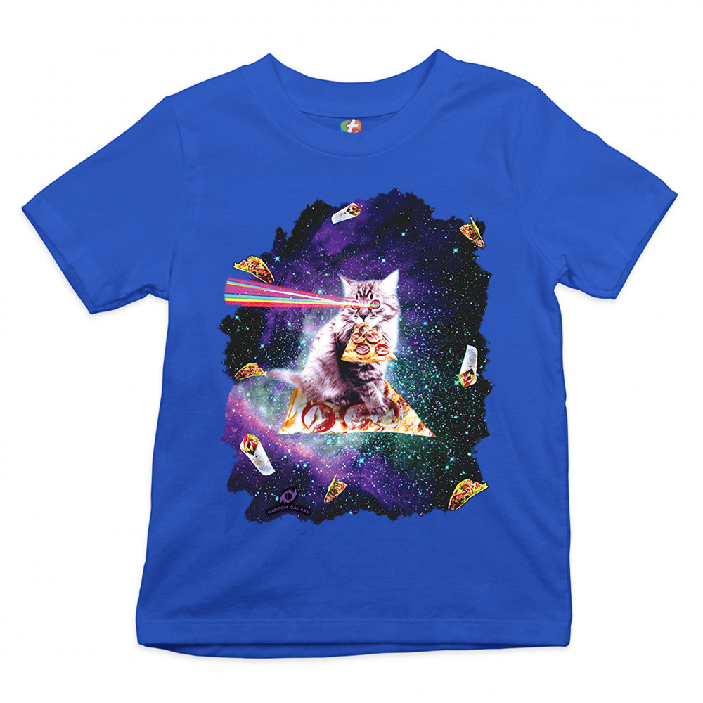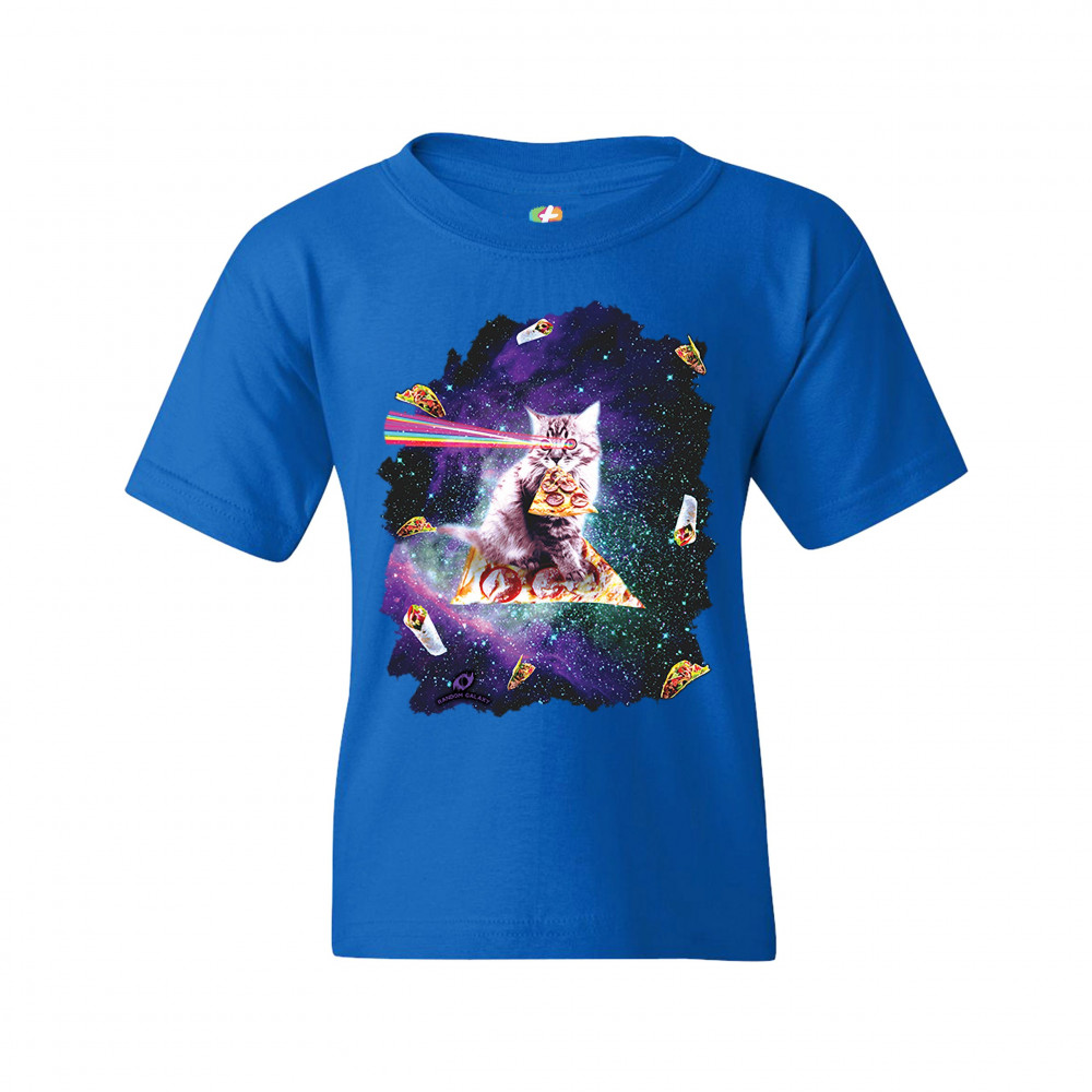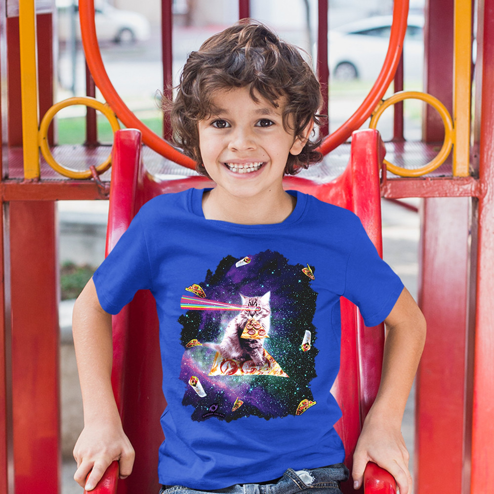 CAT FIRING RAINBOW LASER RIDING PIZZA SLICE IN SPACE youth t-shirt weird kids royal blue
