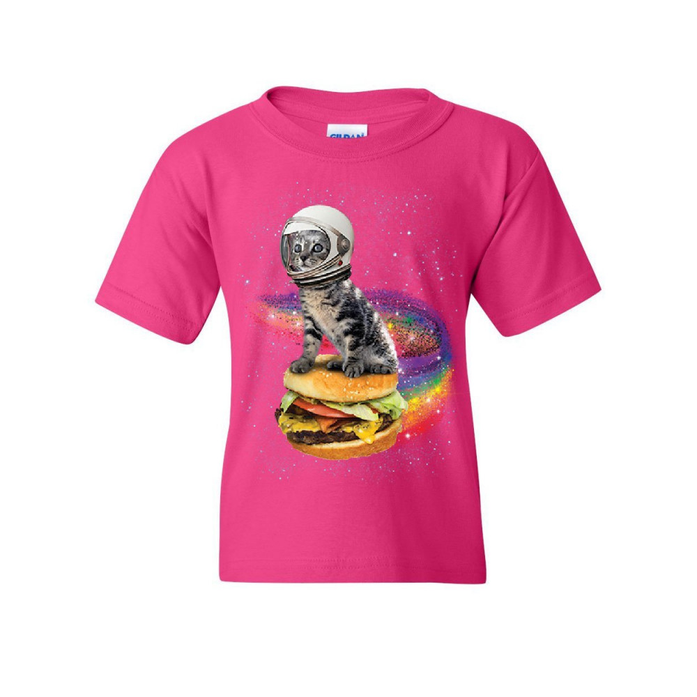 CAT FLYING A RAINBOW BURGER youth t-shirt funny astronaut kitten space kids tee pink