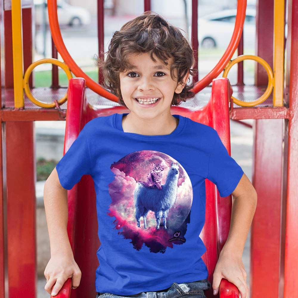 CAT RIDING A LLAMA IN SPACE youth t-shirt weird galaxy moon creative kids royal blue