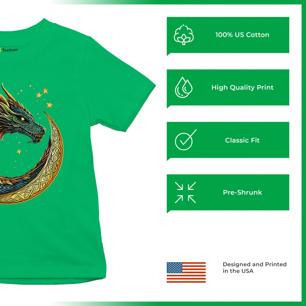 Fierce dragon in Celtic crescent moon with glowing eyes and starry sky. Perfect for fantasy fans, gamers, and spiritual warriors seeking mythic art.