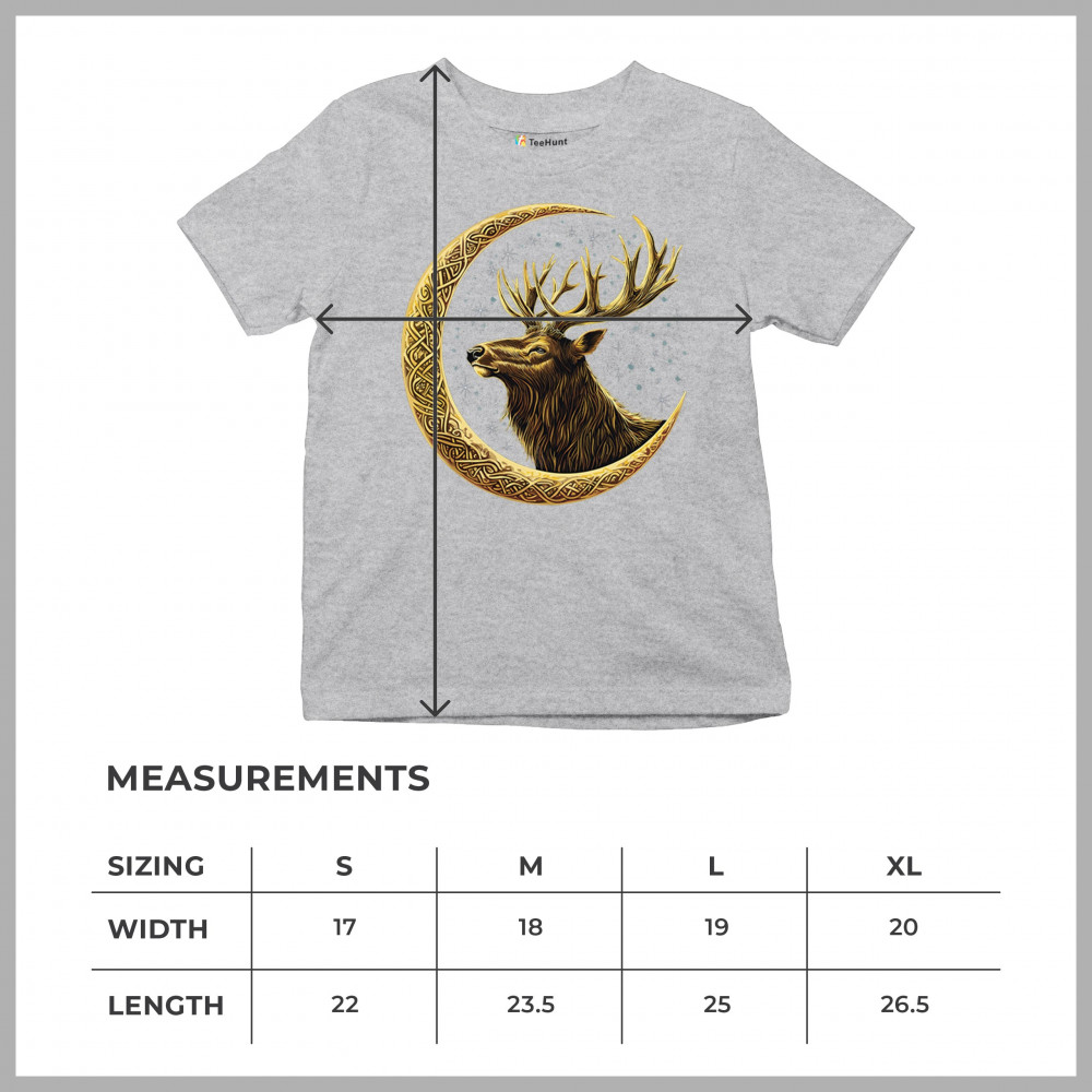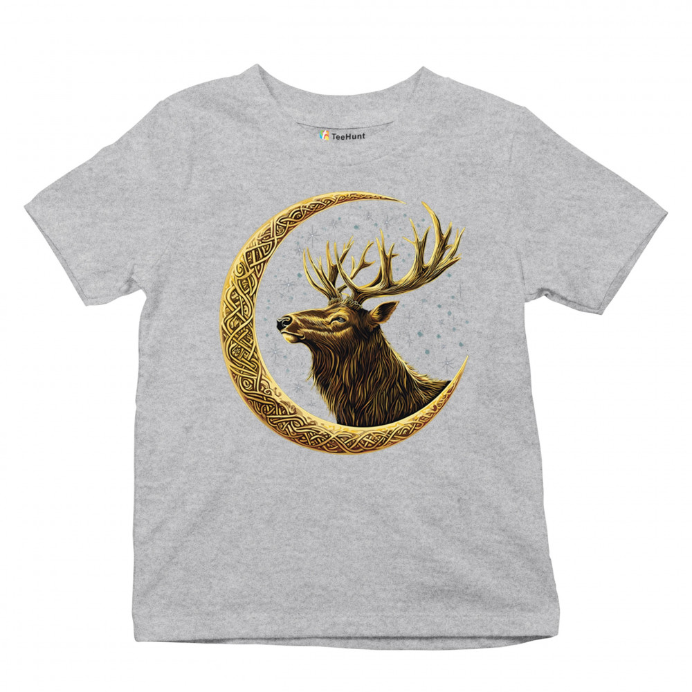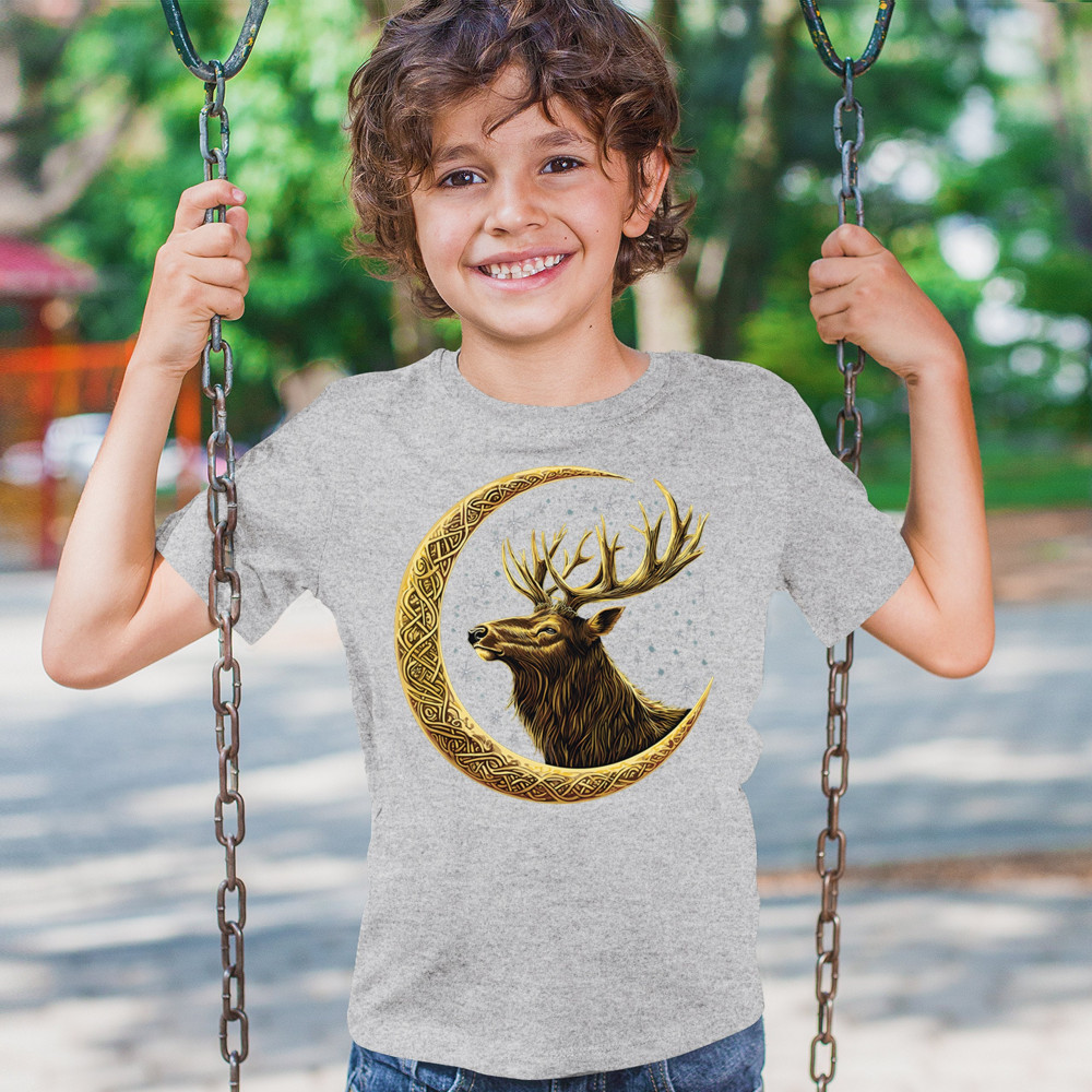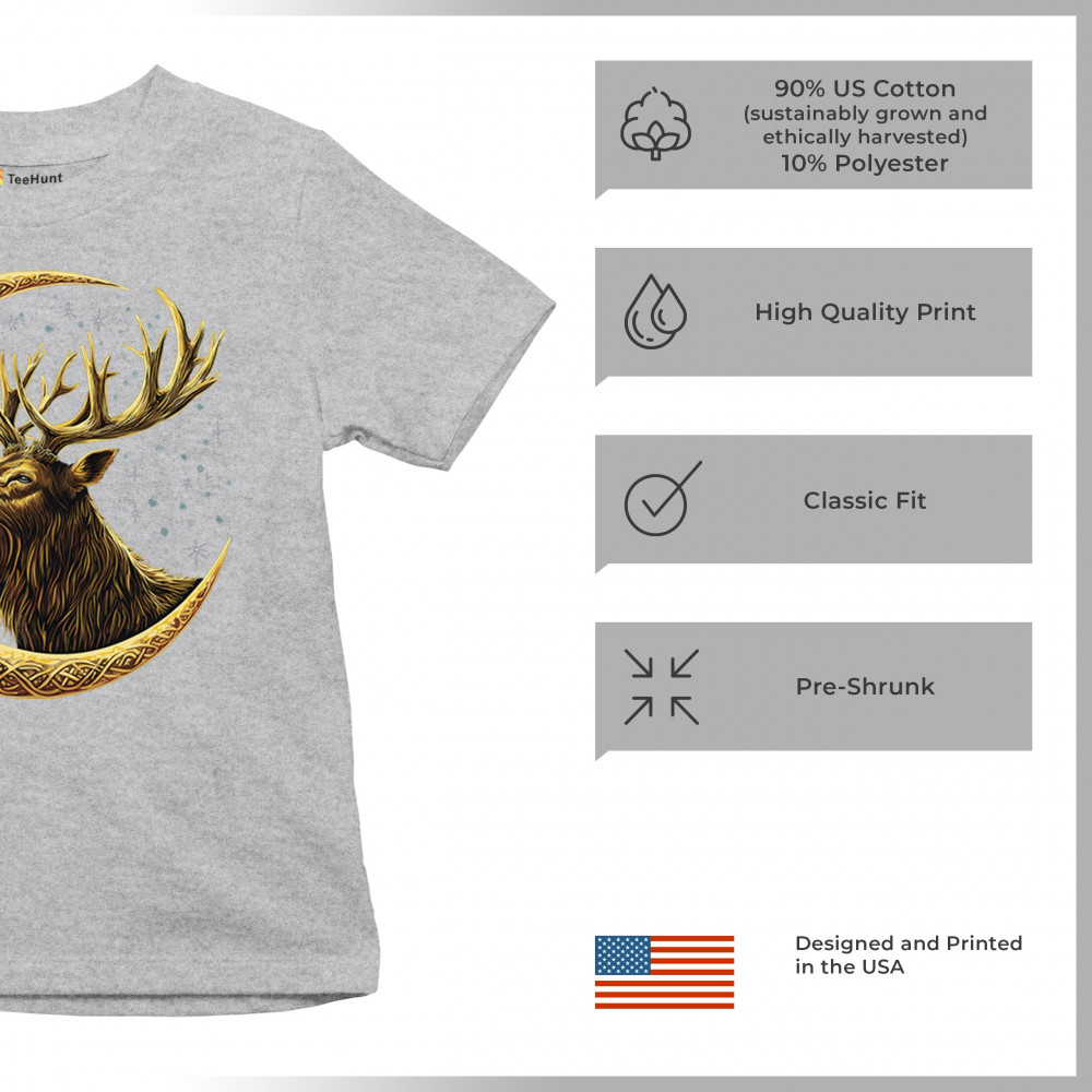 Celtic stag design with golden moon and cosmic stars. Symbolizes forest strength, leadership, and spiritual energy. Perfect for nature lovers.