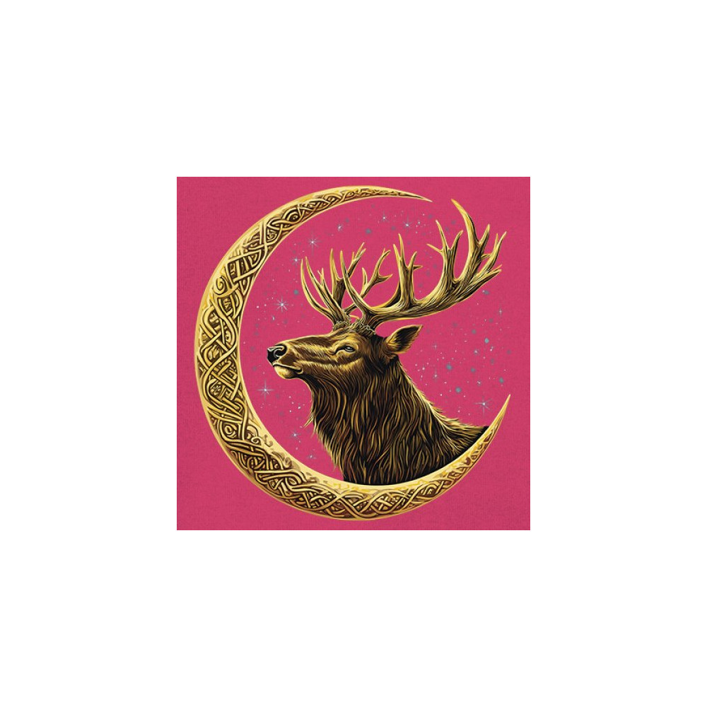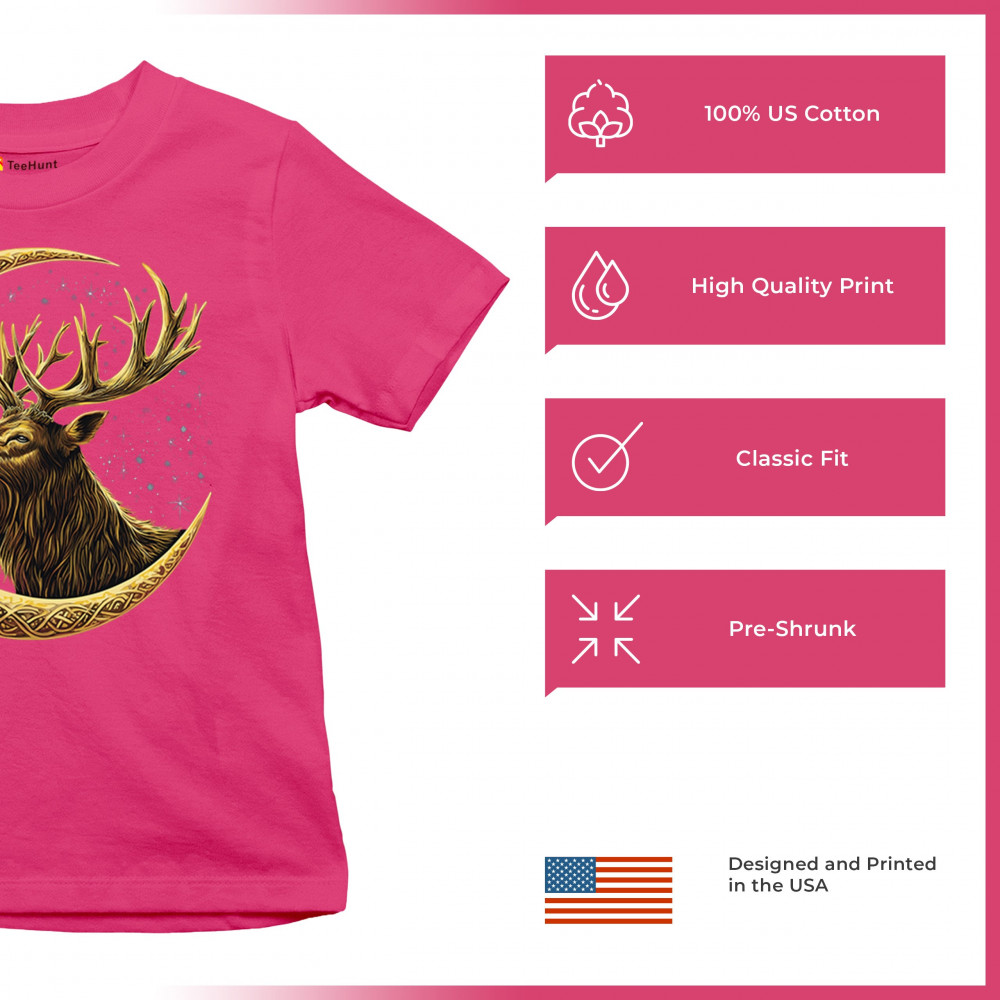Celtic stag design with golden moon and cosmic stars. Symbolizes forest strength, leadership, and spiritual energy. Perfect for nature lovers.