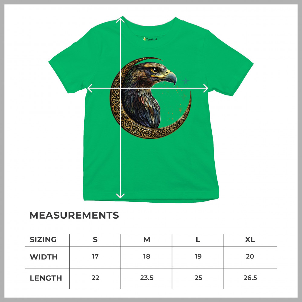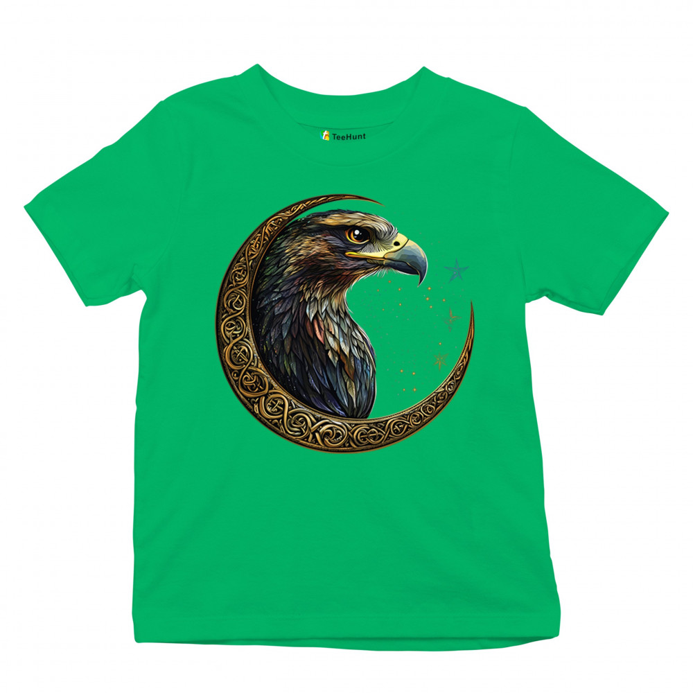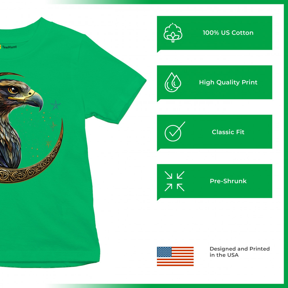 A beautifully detailed eagle with vibrant feathers is framed by a golden Celtic crescent moon and surrounded by a starry cosmic sky. This striking design represents freedom, spiritual power, and the mystery of the skies. Perfect for patriots, bird lovers, and those who connect with nature, tribal symbolism, and celestial art.