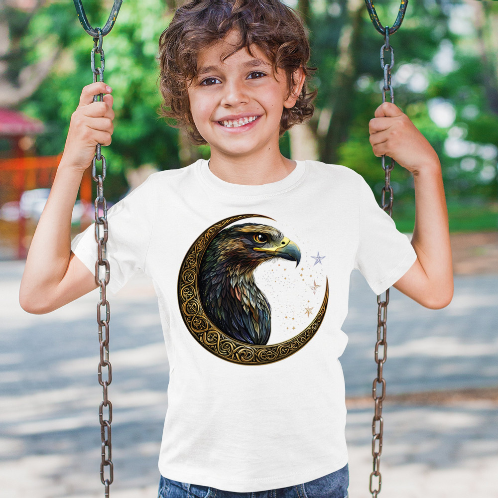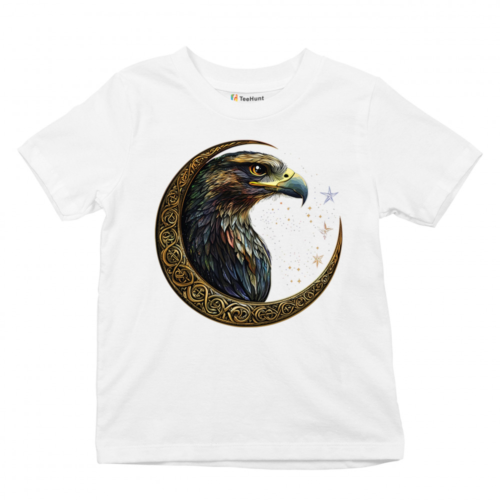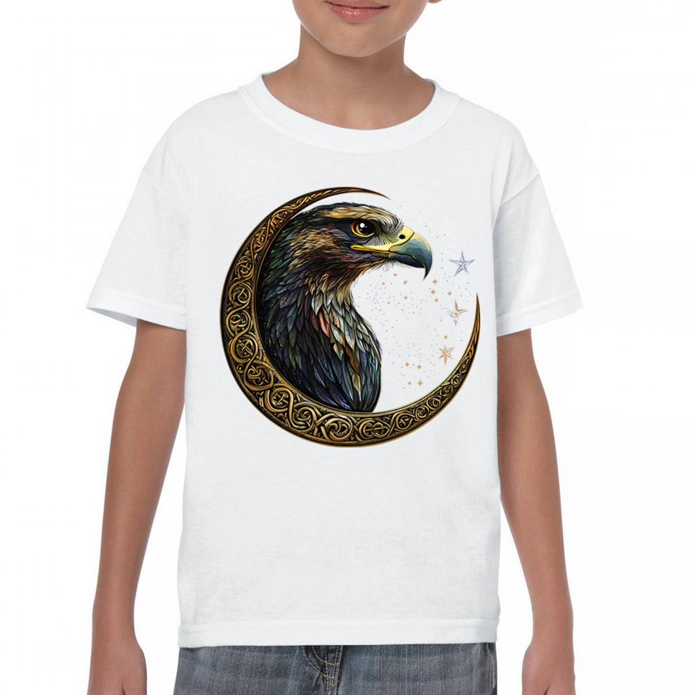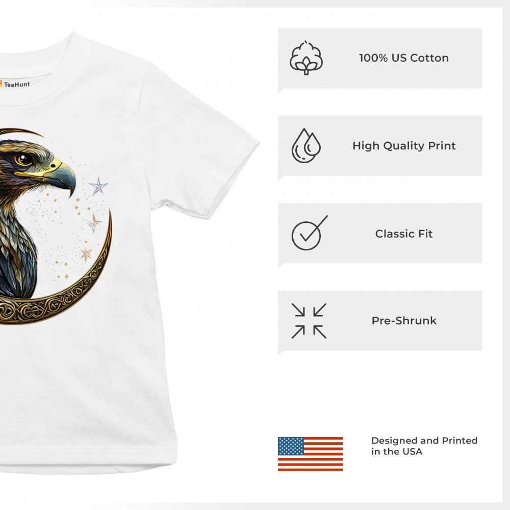 A beautifully detailed eagle with vibrant feathers is framed by a golden Celtic crescent moon and surrounded by a starry cosmic sky. This striking design represents freedom, spiritual power, and the mystery of the skies. Perfect for patriots, bird lovers, and those who connect with nature, tribal symbolism, and celestial art.