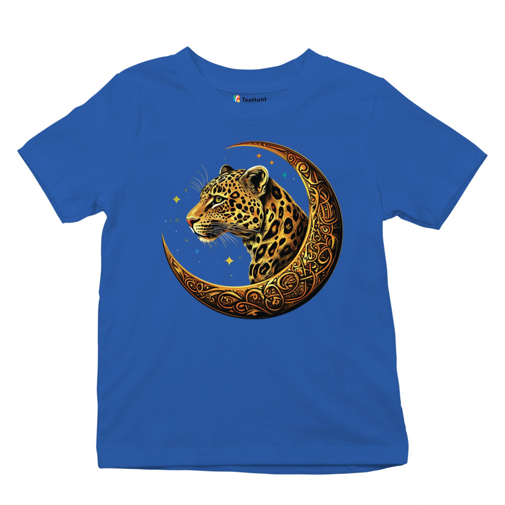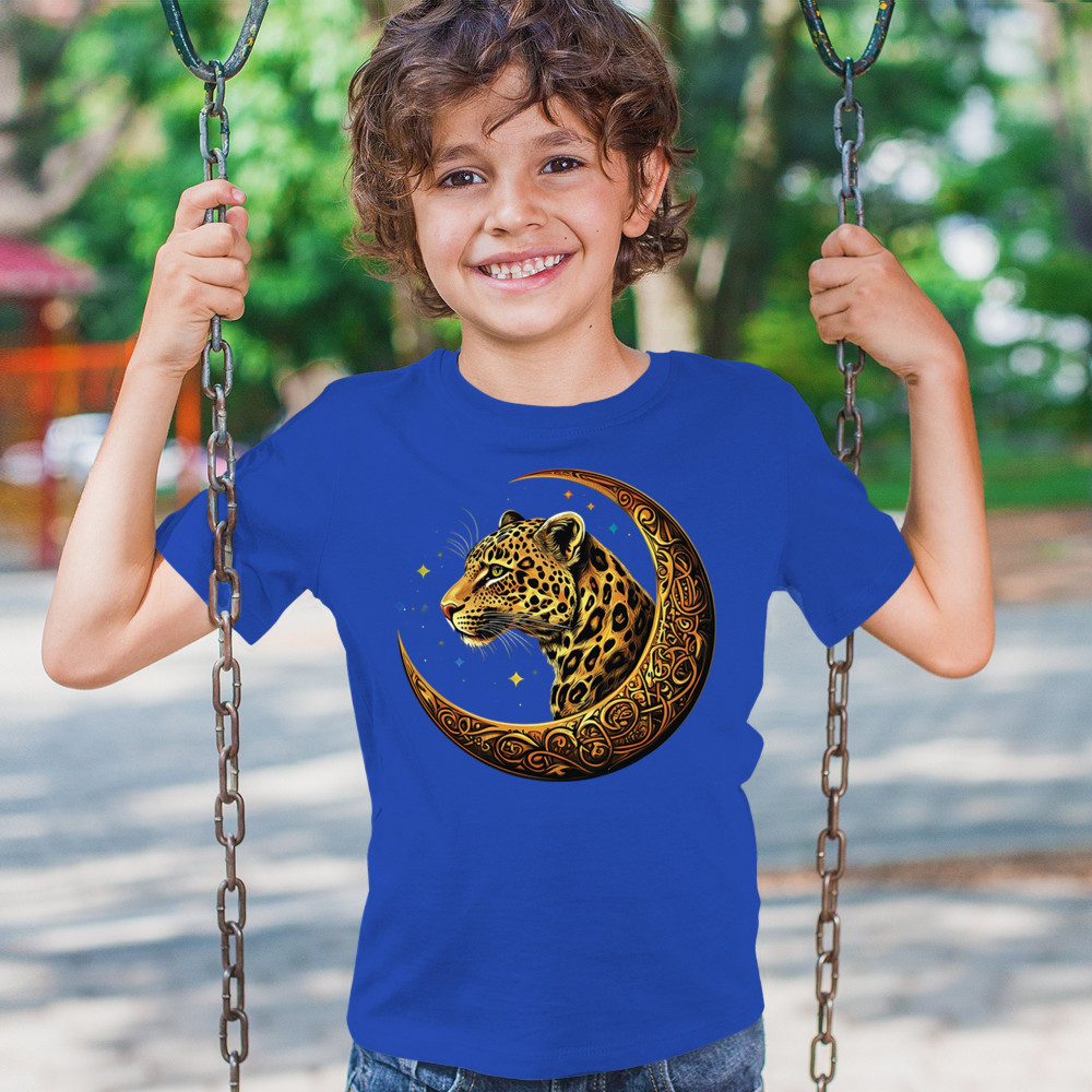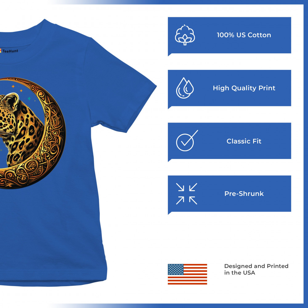 Unleash wild energy and spiritual symbolism with this bold leopard design set inside a golden Celtic crescent moon. A cosmic starry background amplifies its mystical vibe, symbolizing agility, independence, and awareness. Perfect for big cat lovers, jungle animal fans, and seekers of fantasy or tribal-inspired art.
