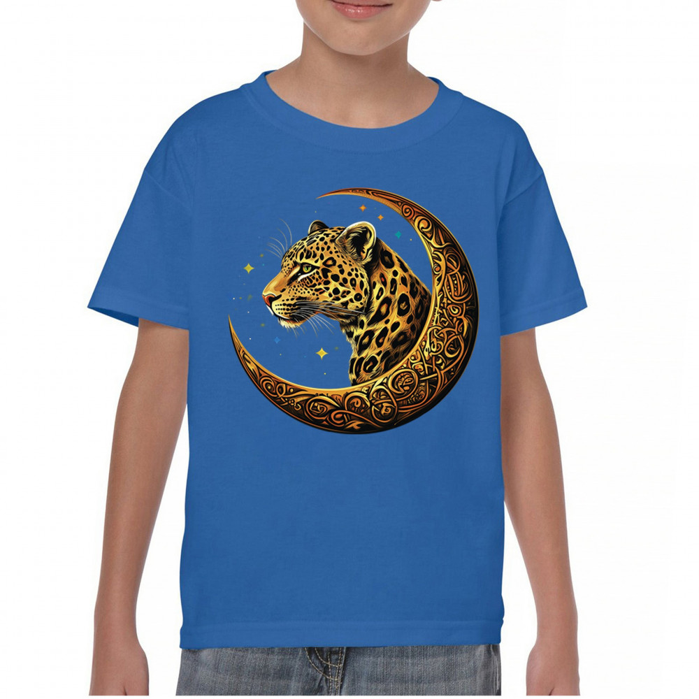 Leopard in Celtic moon with cosmic background. A fierce and spiritual design for big cat lovers, jungle fans, mystics, and fantasy art seekers.