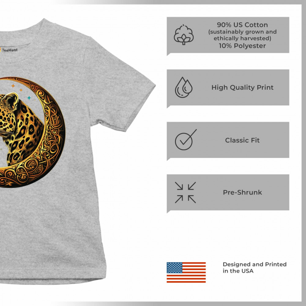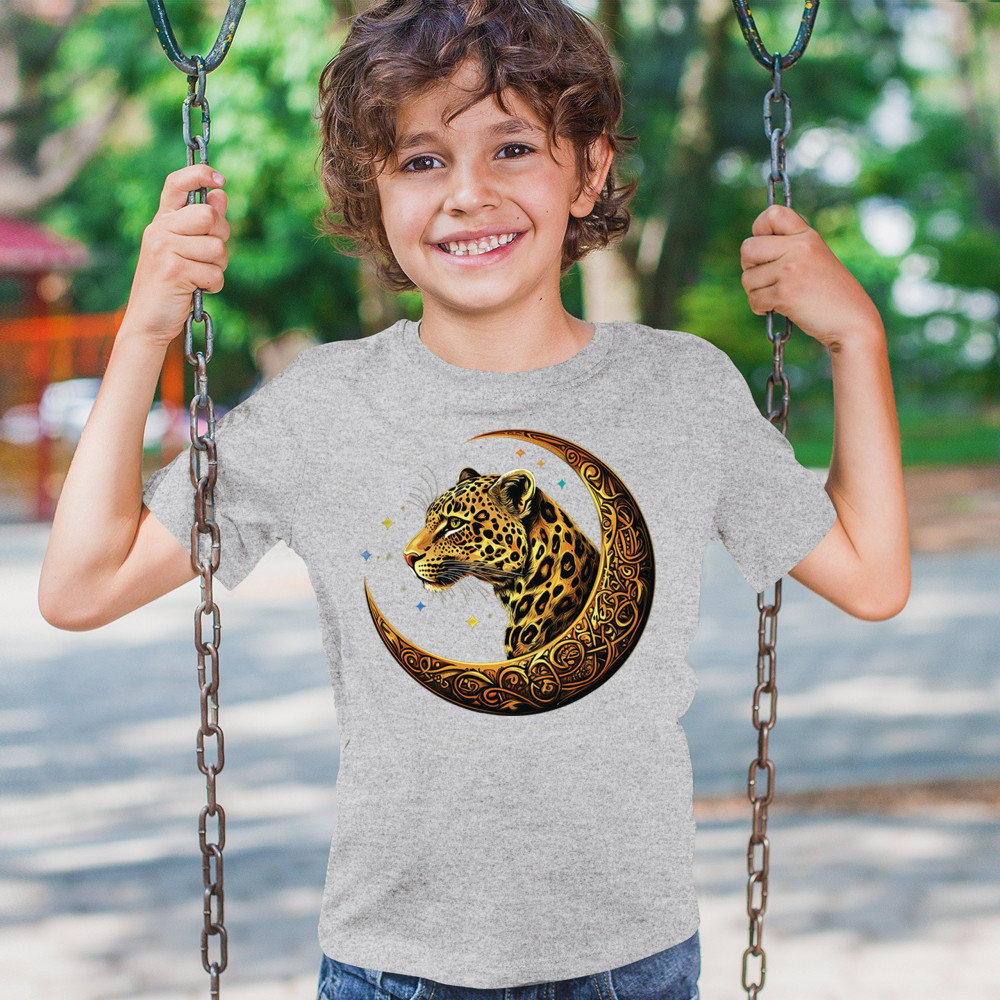 Unleash wild energy and spiritual symbolism with this bold leopard design set inside a golden Celtic crescent moon. A cosmic starry background amplifies its mystical vibe, symbolizing agility, independence, and awareness. Perfect for big cat lovers, jungle animal fans, and seekers of fantasy or tribal-inspired art.