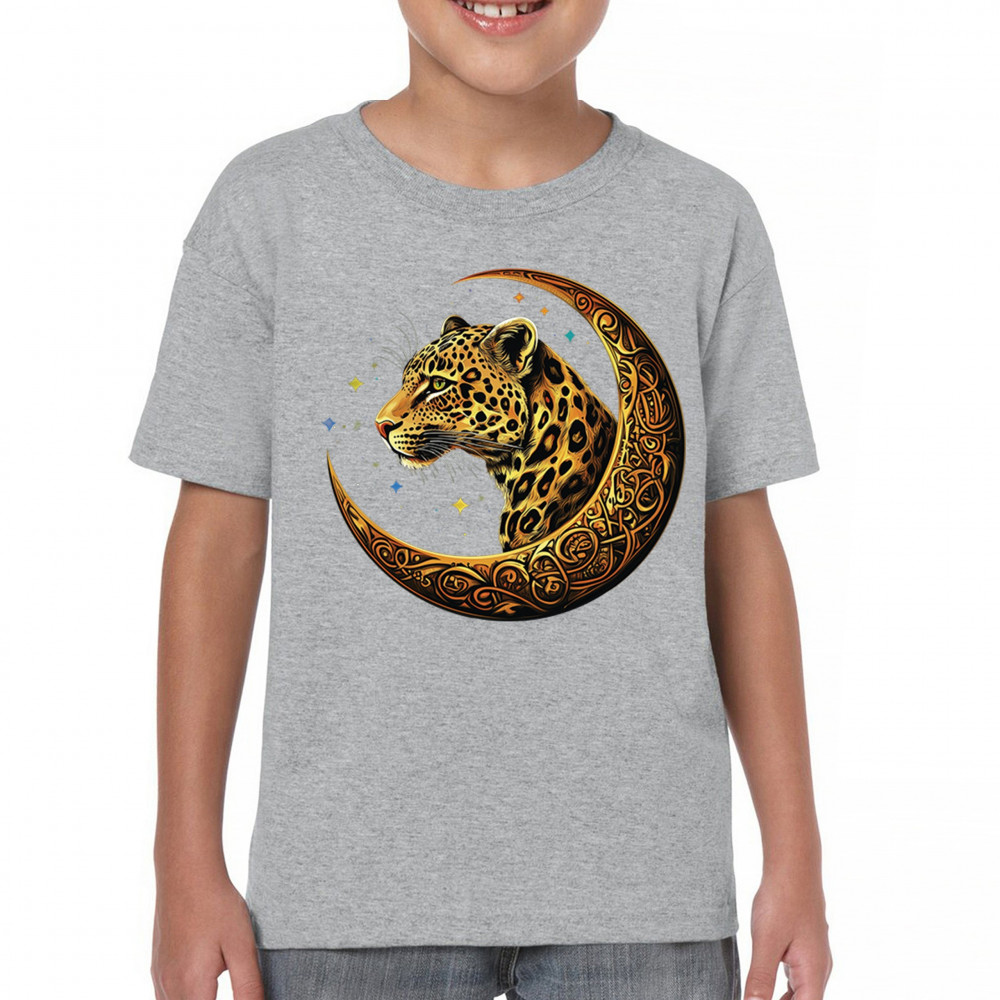 Leopard in Celtic moon with cosmic background. A fierce and spiritual design for big cat lovers, jungle fans, mystics, and fantasy art seekers.