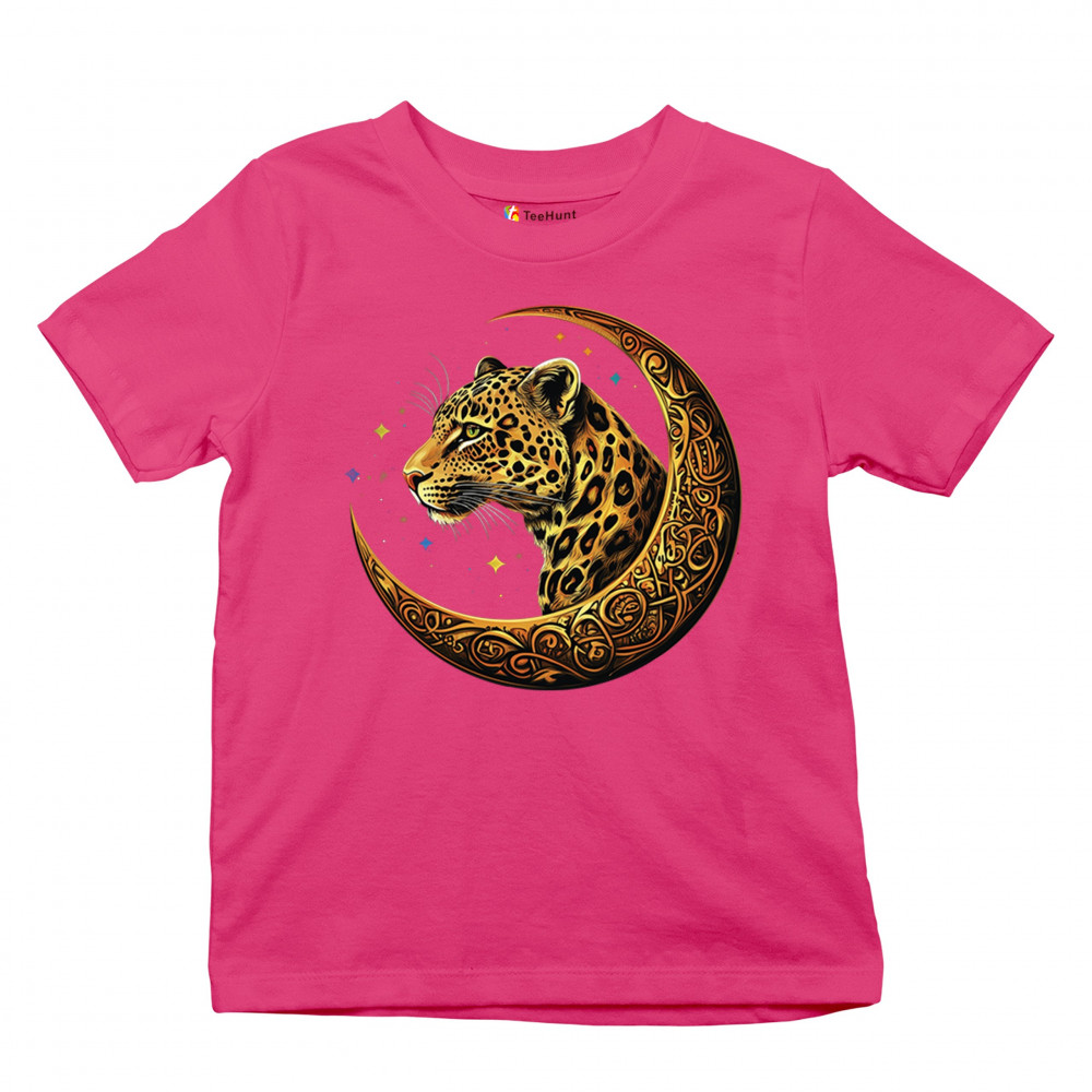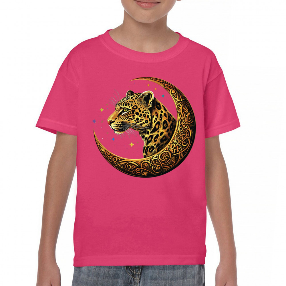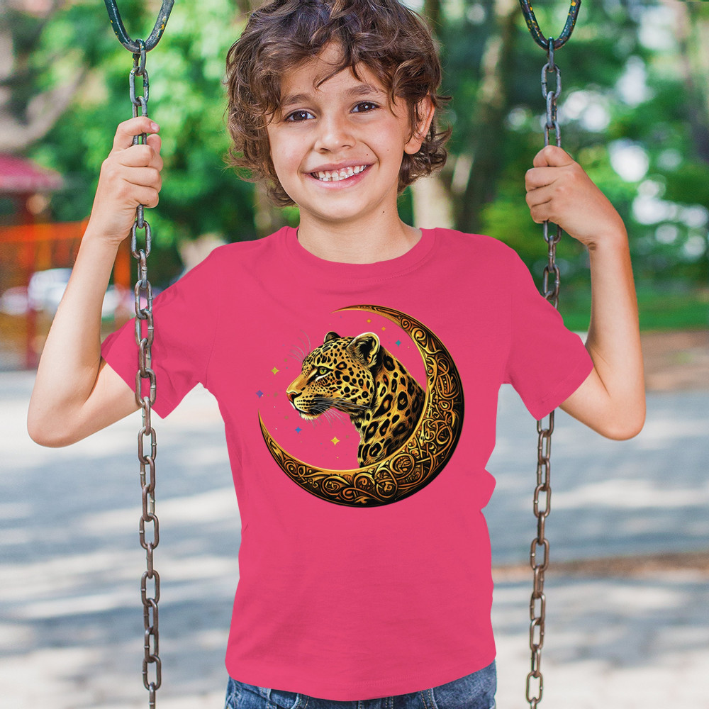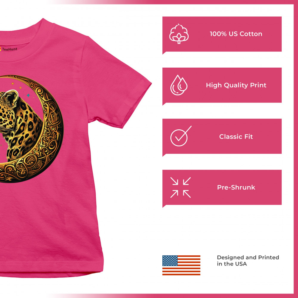 Unleash wild energy and spiritual symbolism with this bold leopard design set inside a golden Celtic crescent moon. A cosmic starry background amplifies its mystical vibe, symbolizing agility, independence, and awareness. Perfect for big cat lovers, jungle animal fans, and seekers of fantasy or tribal-inspired art.