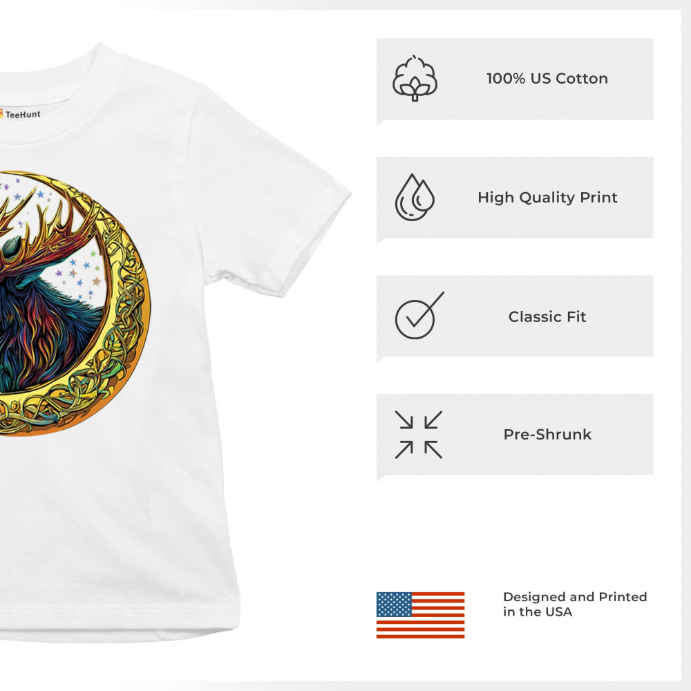 This vibrant moose design blends tribal art and fantasy energy with a golden Celtic crescent moon. Cosmic fur, radiant antlers, and a star-speckled sky make this image a symbol of strength, natural wisdom, and mysticism. Ideal for druids, hunters, fantasy fans, or spirit animal seekers connected to the forest and celestial realm.