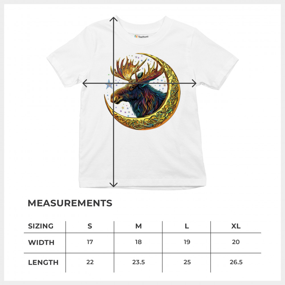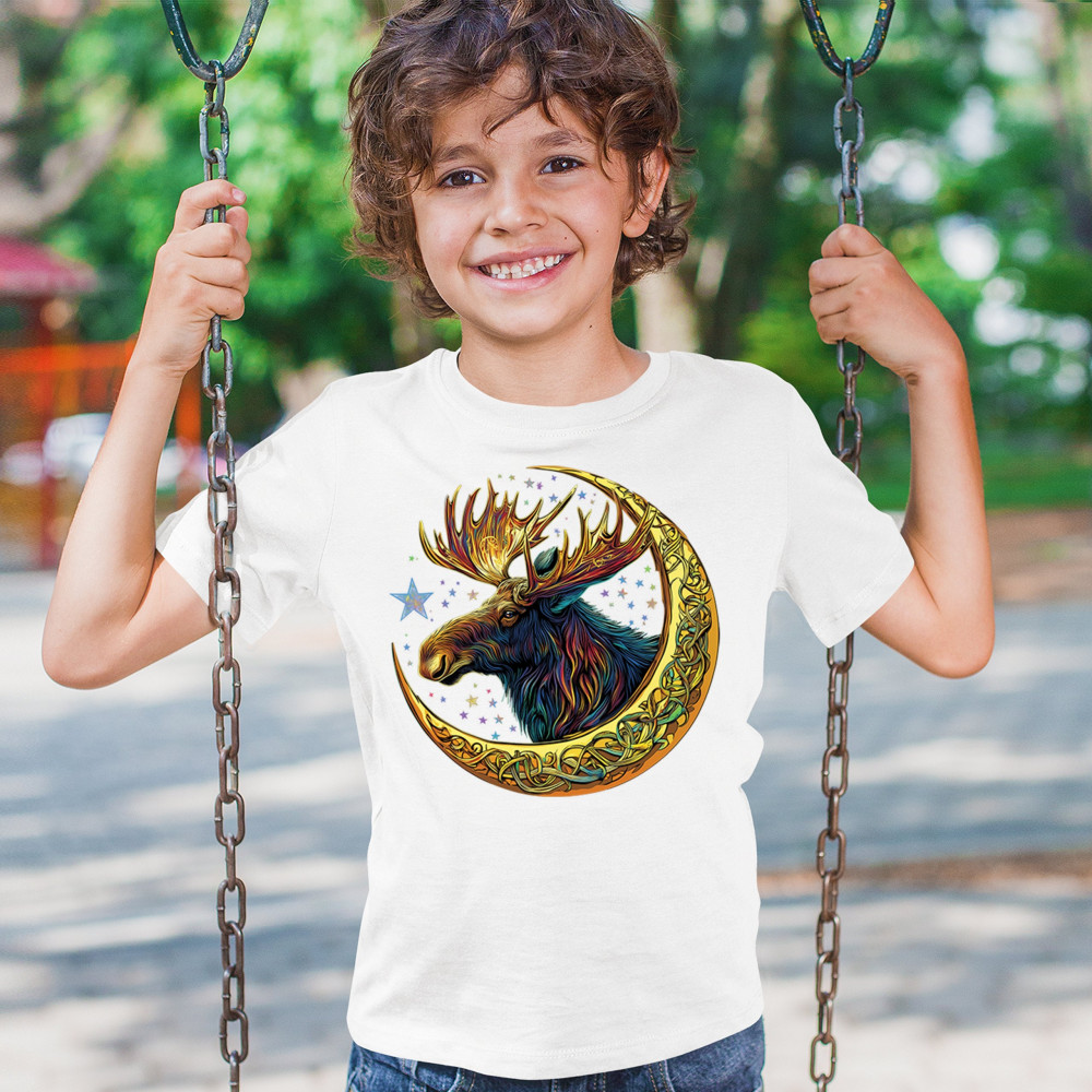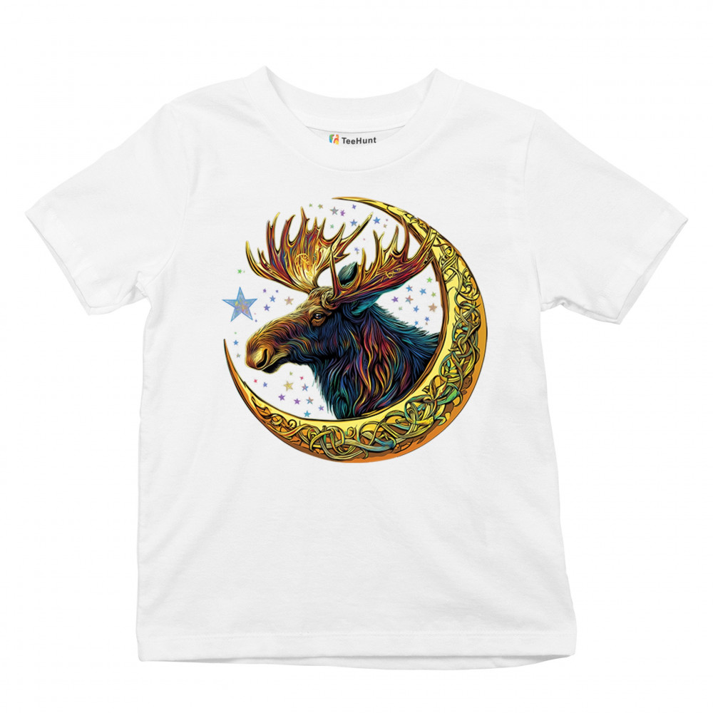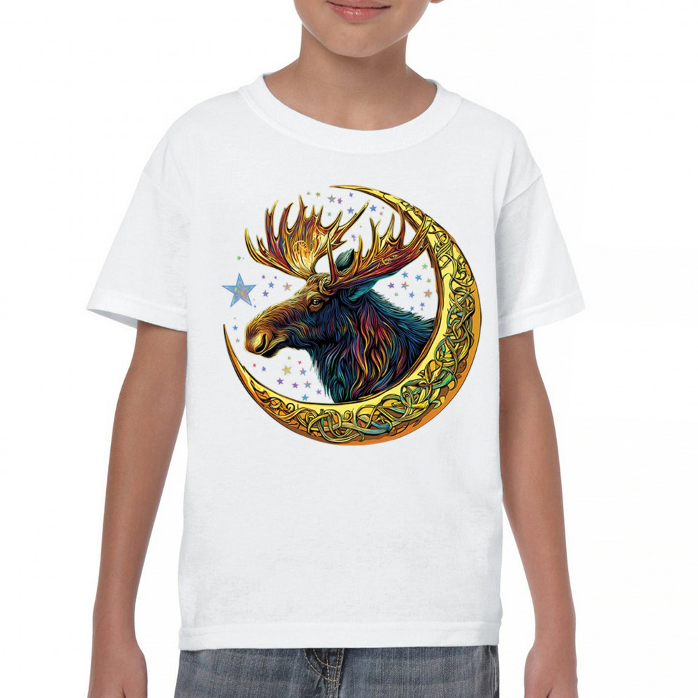 Mystical moose in gold Celtic crescent moon design—symbolizes strength, nature wisdom, and cosmic spirit for fantasy lovers and woodland fans.