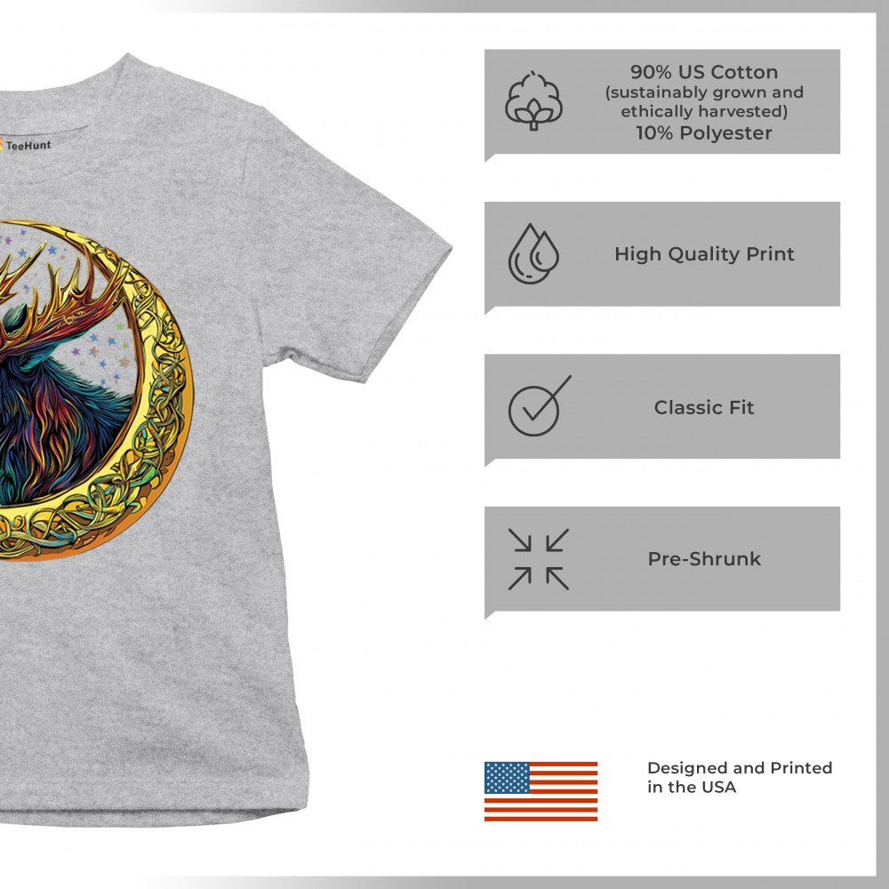 This vibrant moose design blends tribal art and fantasy energy with a golden Celtic crescent moon. Cosmic fur, radiant antlers, and a star-speckled sky make this image a symbol of strength, natural wisdom, and mysticism. Ideal for druids, hunters, fantasy fans, or spirit animal seekers connected to the forest and celestial realm.
