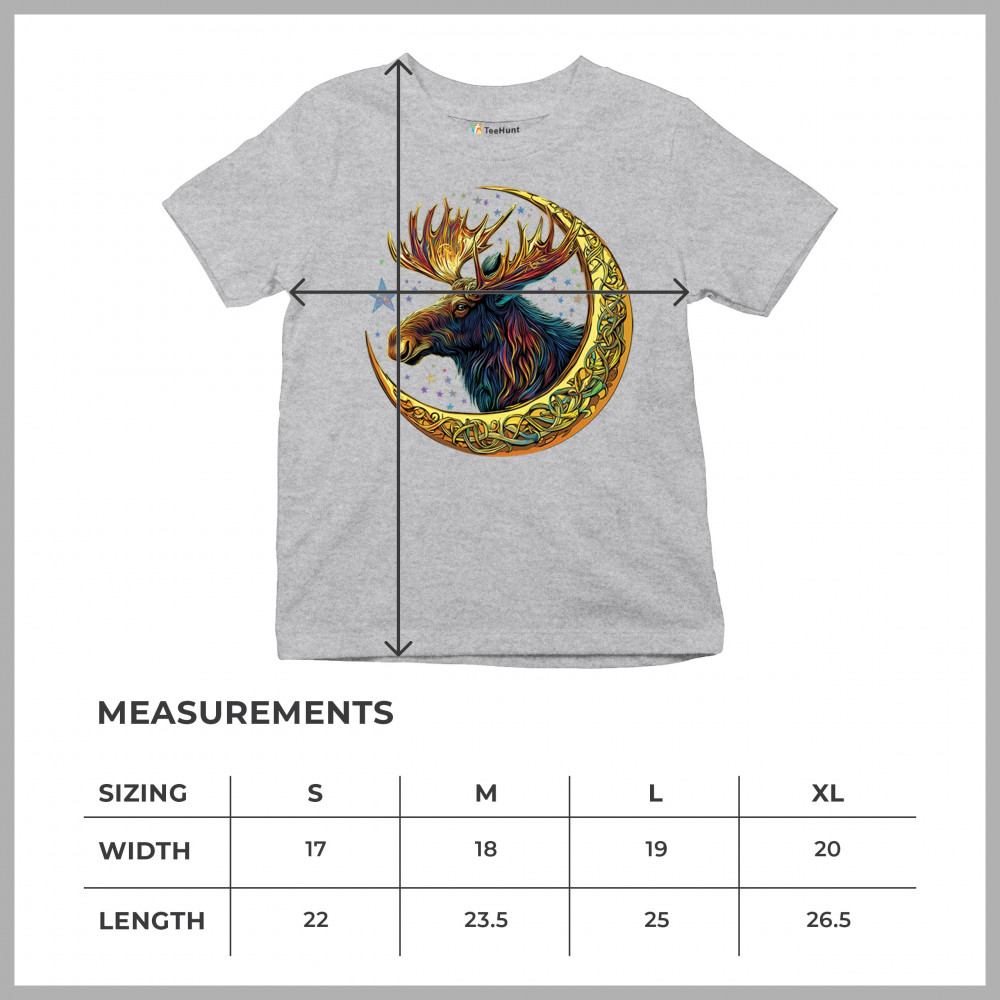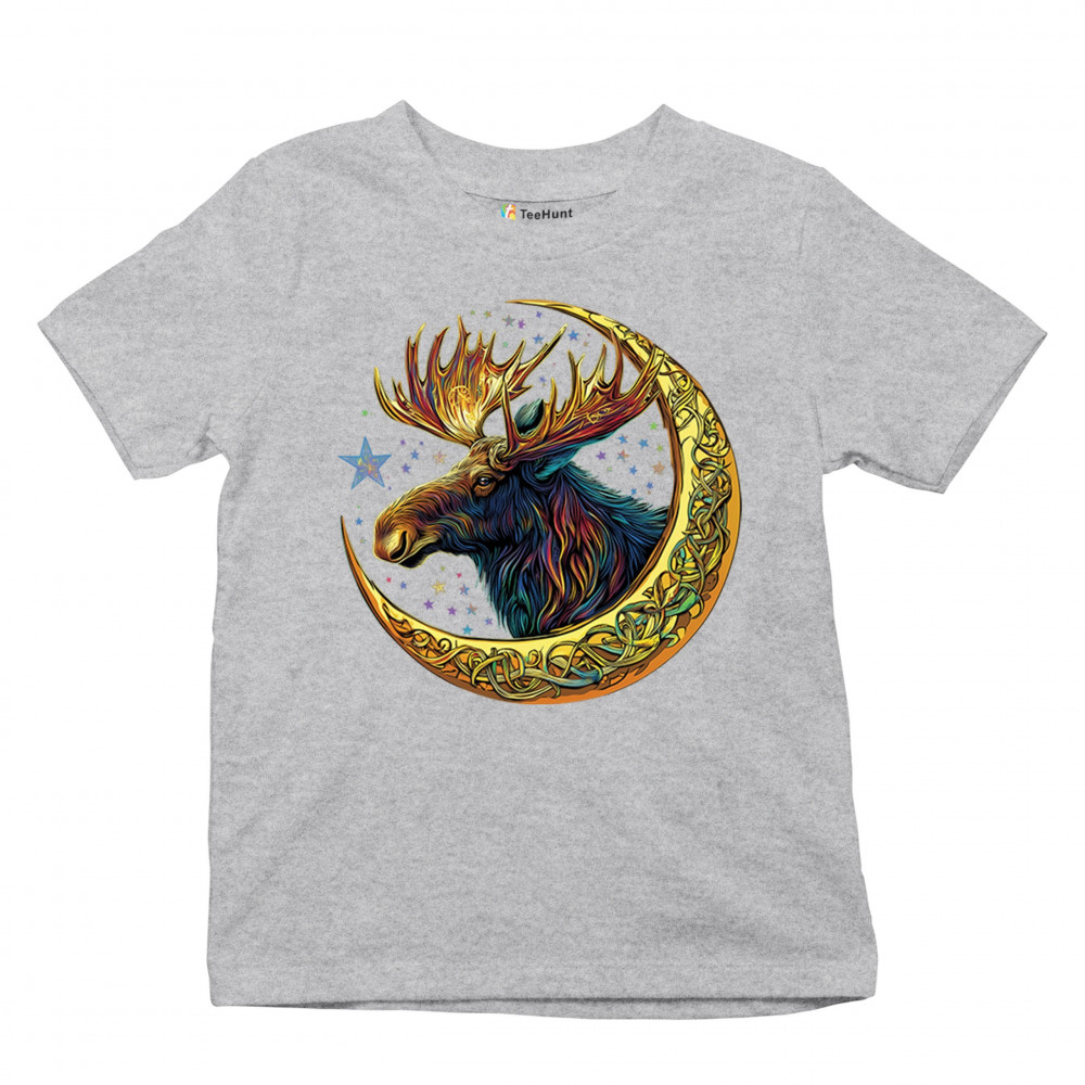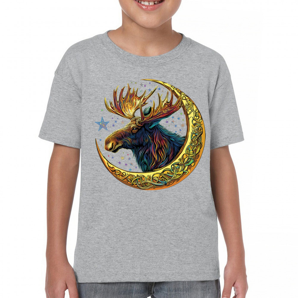 Mystical moose in gold Celtic crescent moon design—symbolizes strength, nature wisdom, and cosmic spirit for fantasy lovers and woodland fans.
