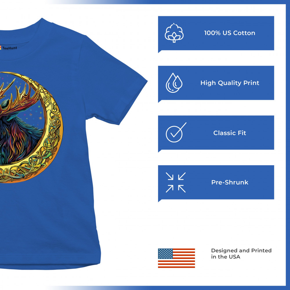 This vibrant moose design blends tribal art and fantasy energy with a golden Celtic crescent moon. Cosmic fur, radiant antlers, and a star-speckled sky make this image a symbol of strength, natural wisdom, and mysticism. Ideal for druids, hunters, fantasy fans, or spirit animal seekers connected to the forest and celestial realm.
