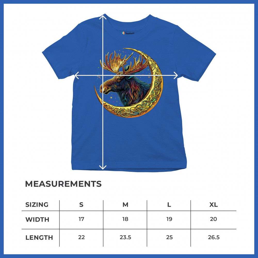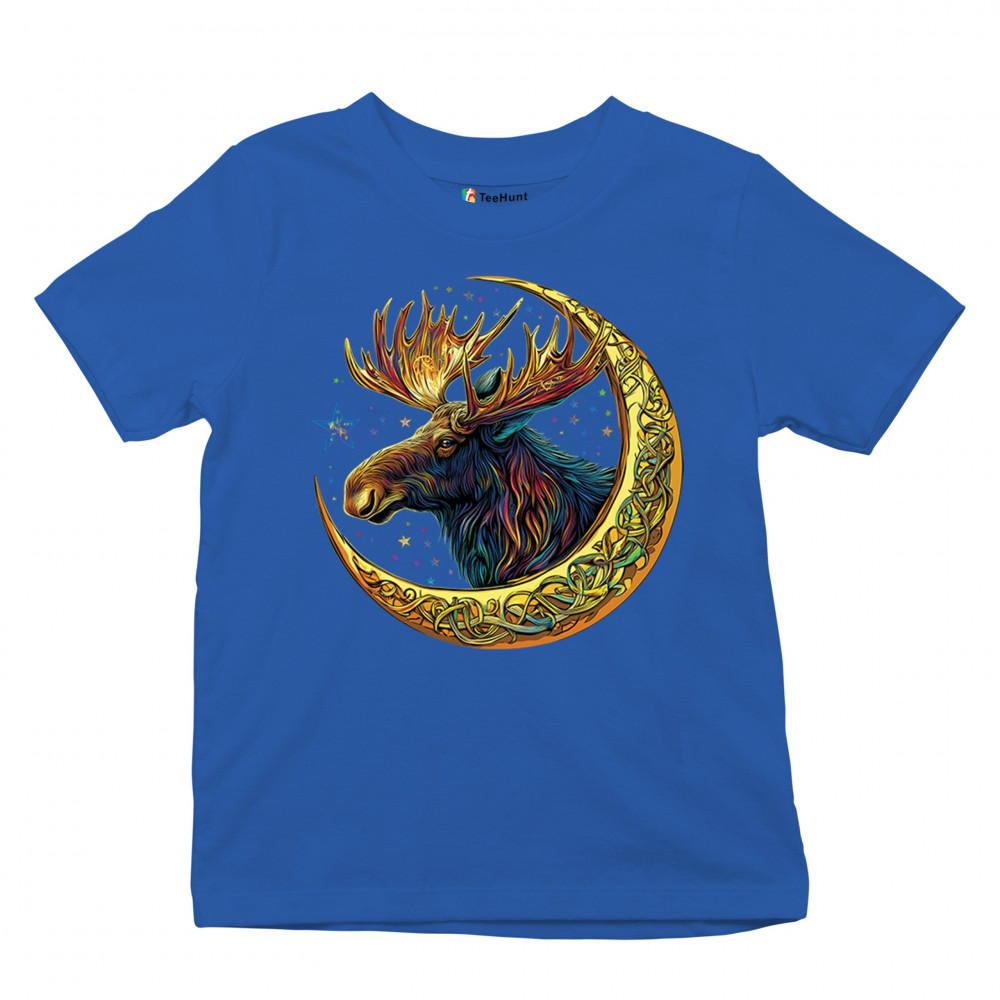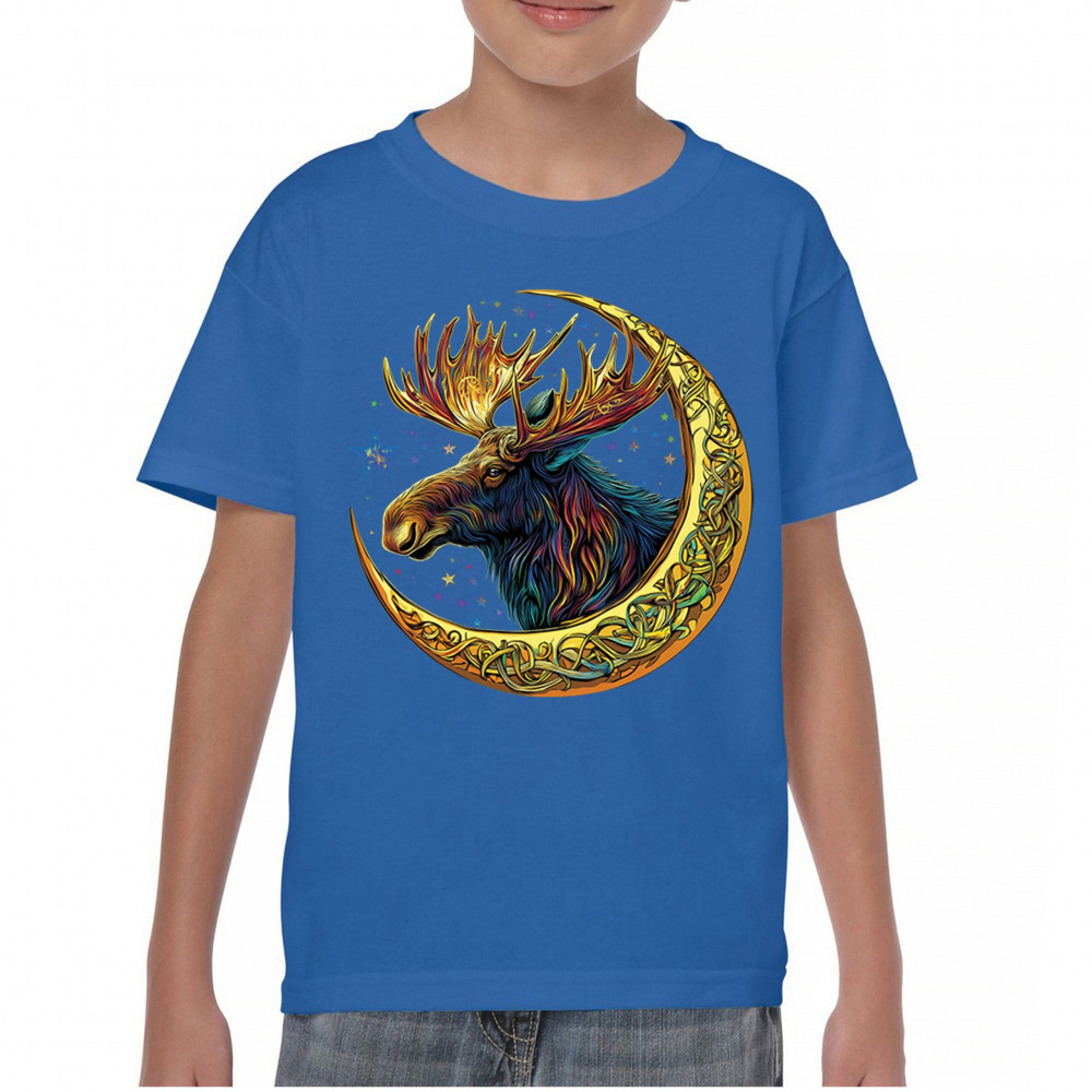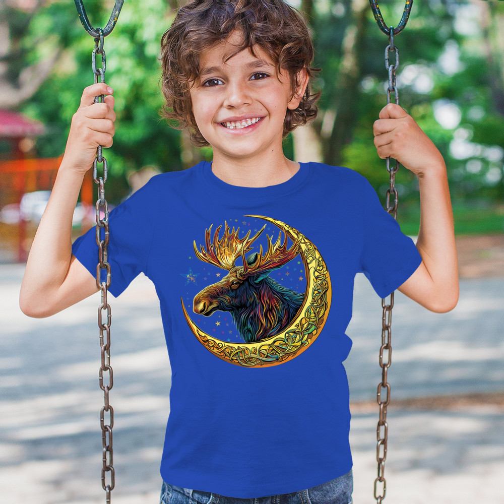Mystical moose in gold Celtic crescent moon design—symbolizes strength, nature wisdom, and cosmic spirit for fantasy lovers and woodland fans.