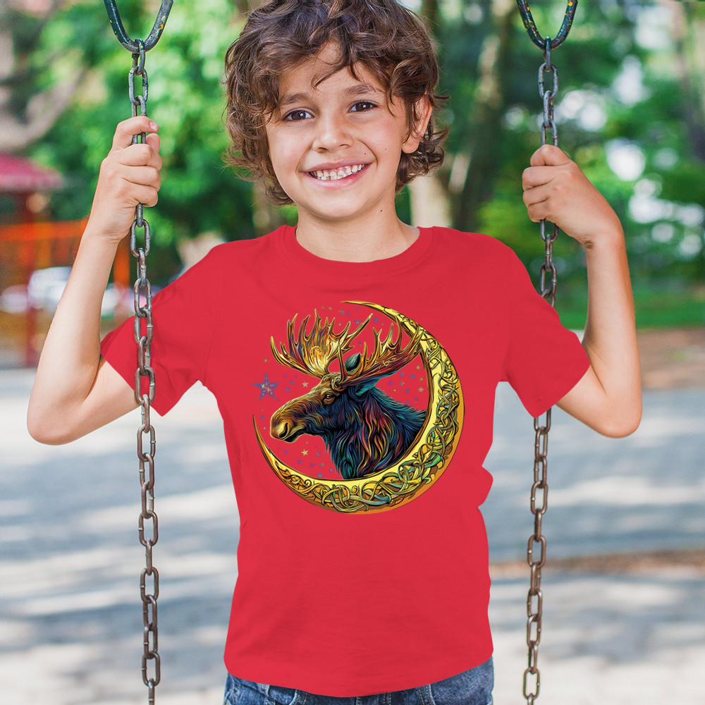 Mystical moose in gold Celtic crescent moon design—symbolizes strength, nature wisdom, and cosmic spirit for fantasy lovers and woodland fans.