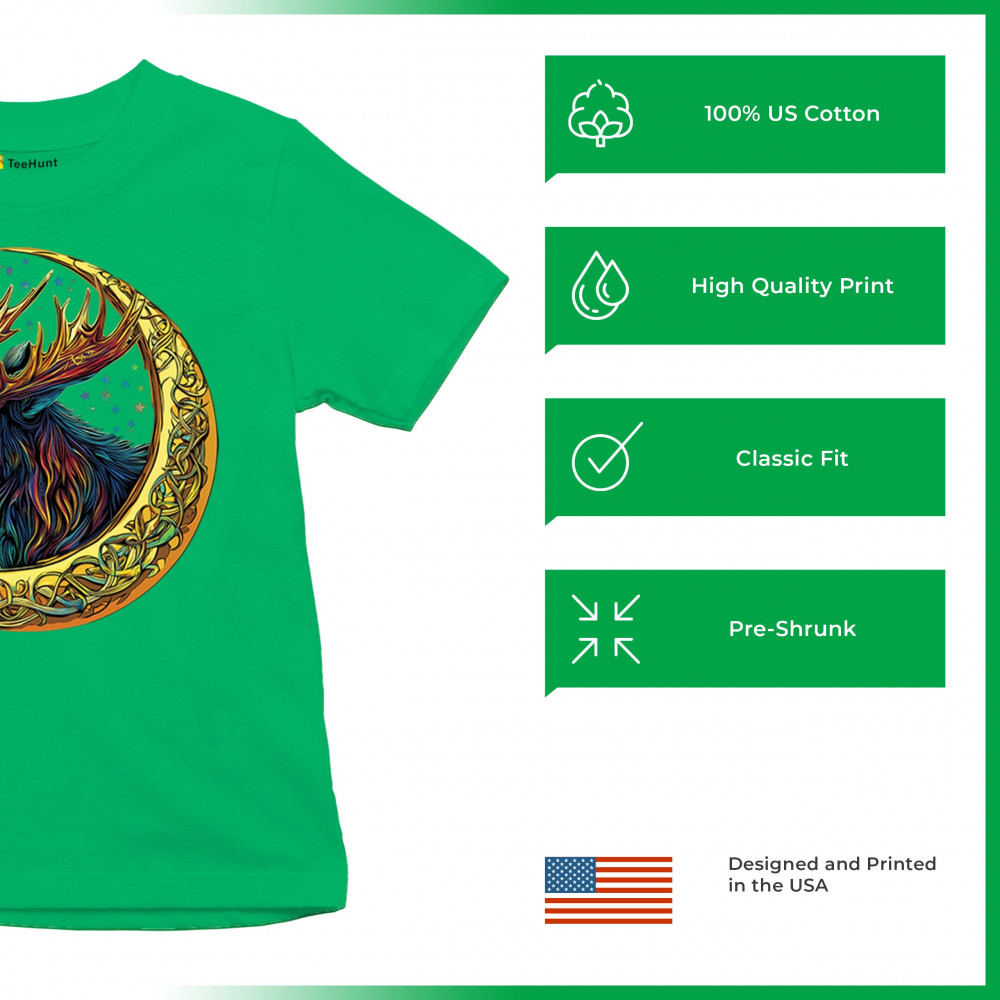 This vibrant moose design blends tribal art and fantasy energy with a golden Celtic crescent moon. Cosmic fur, radiant antlers, and a star-speckled sky make this image a symbol of strength, natural wisdom, and mysticism. Ideal for druids, hunters, fantasy fans, or spirit animal seekers connected to the forest and celestial realm.