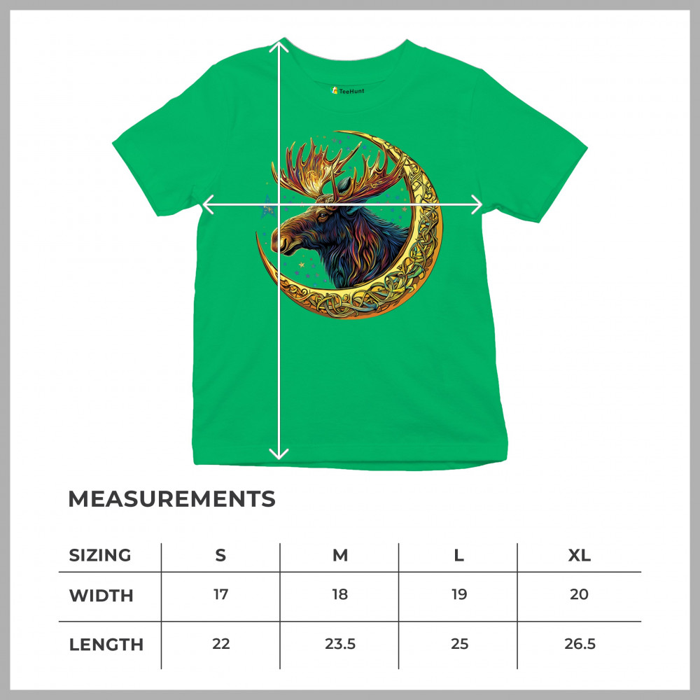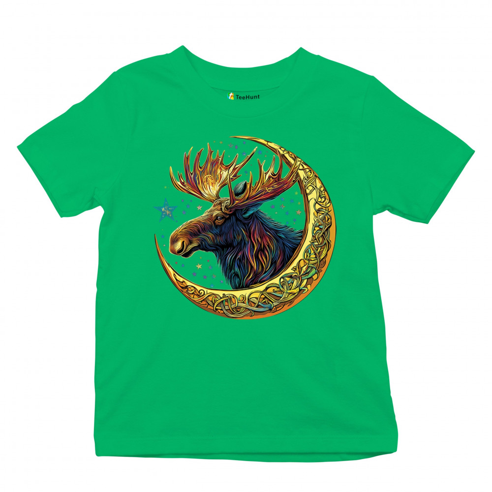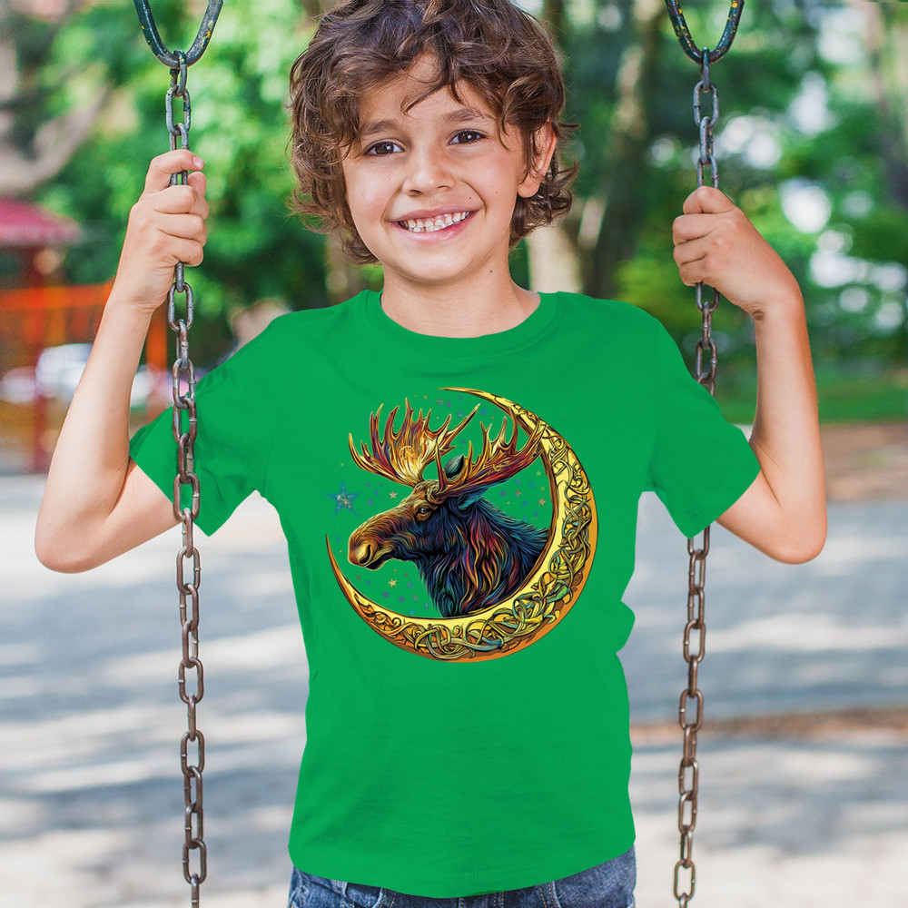 Mystical moose in gold Celtic crescent moon design—symbolizes strength, nature wisdom, and cosmic spirit for fantasy lovers and woodland fans.