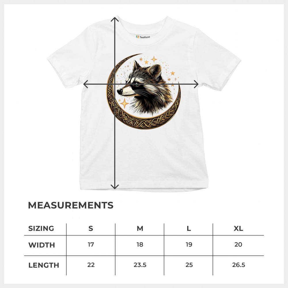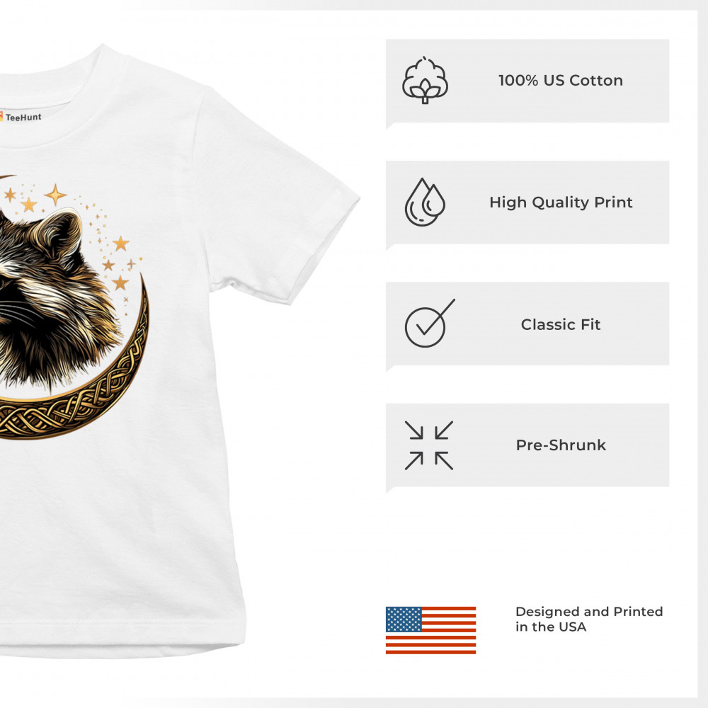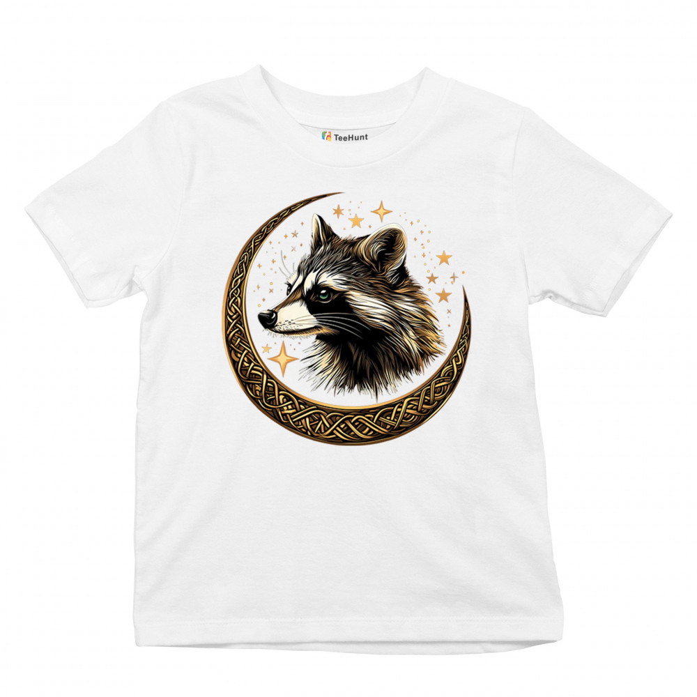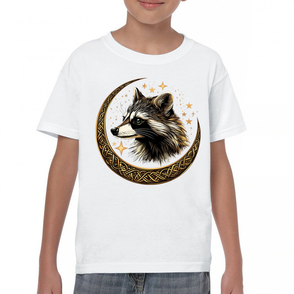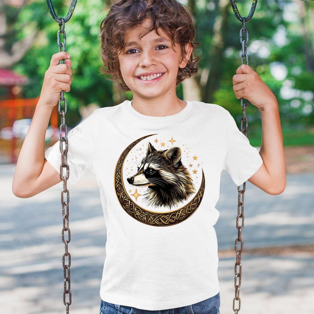 Cosmic raccoon design in Celtic moon. Symbol of adaptability, mystery, and spiritual intelligence. A perfect gift for wild and curious souls.