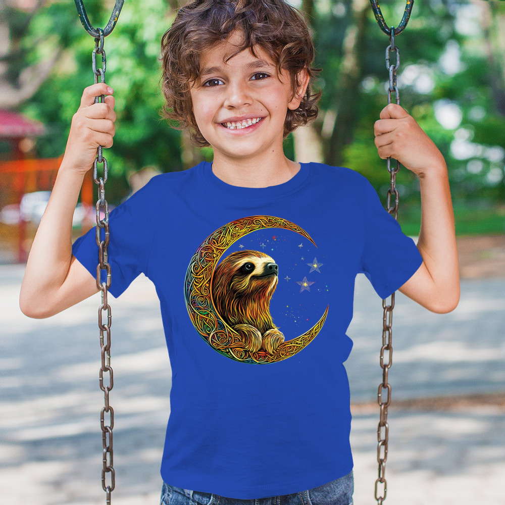 Celebrate peace and presence with this stunning sloth design cradled in a gold Celtic crescent moon. Surrounded by a vibrant starry sky, the image blends jungle whimsy with tribal patterns and mystical vibes. A perfect design for lovers of fantasy animals, mindfulness, and slow living. A beautiful tribute to spiritual stillness and cosmic calm.