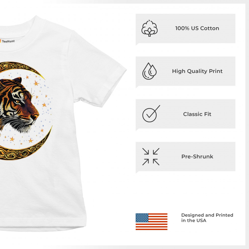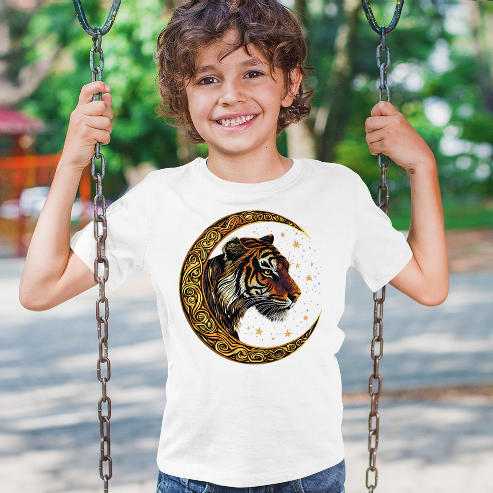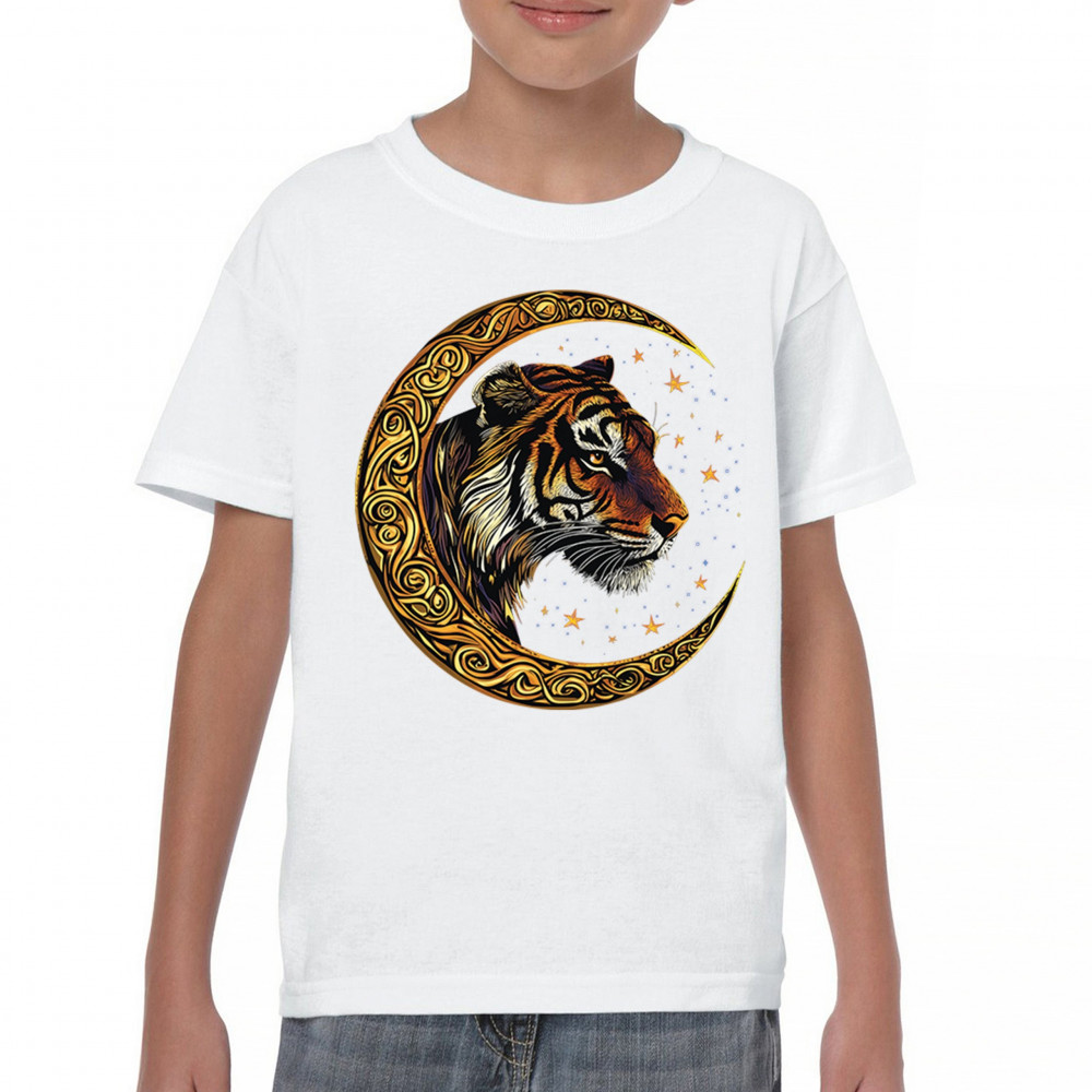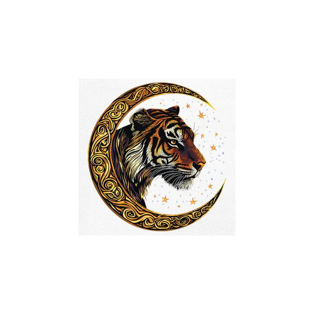 Bold tiger design in Celtic moon with cosmic sky. Symbol of strength, instinct, and jungle mysticism. Great for animal lovers and fantasy fans.