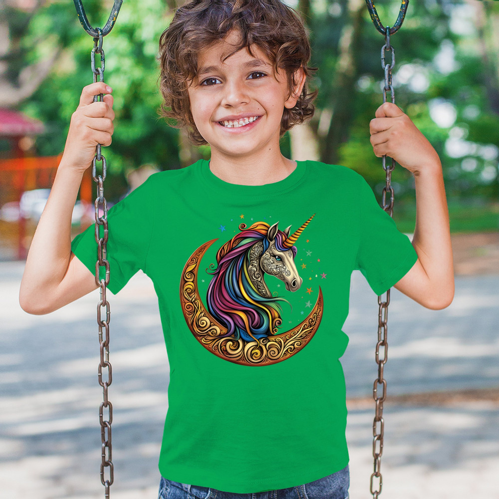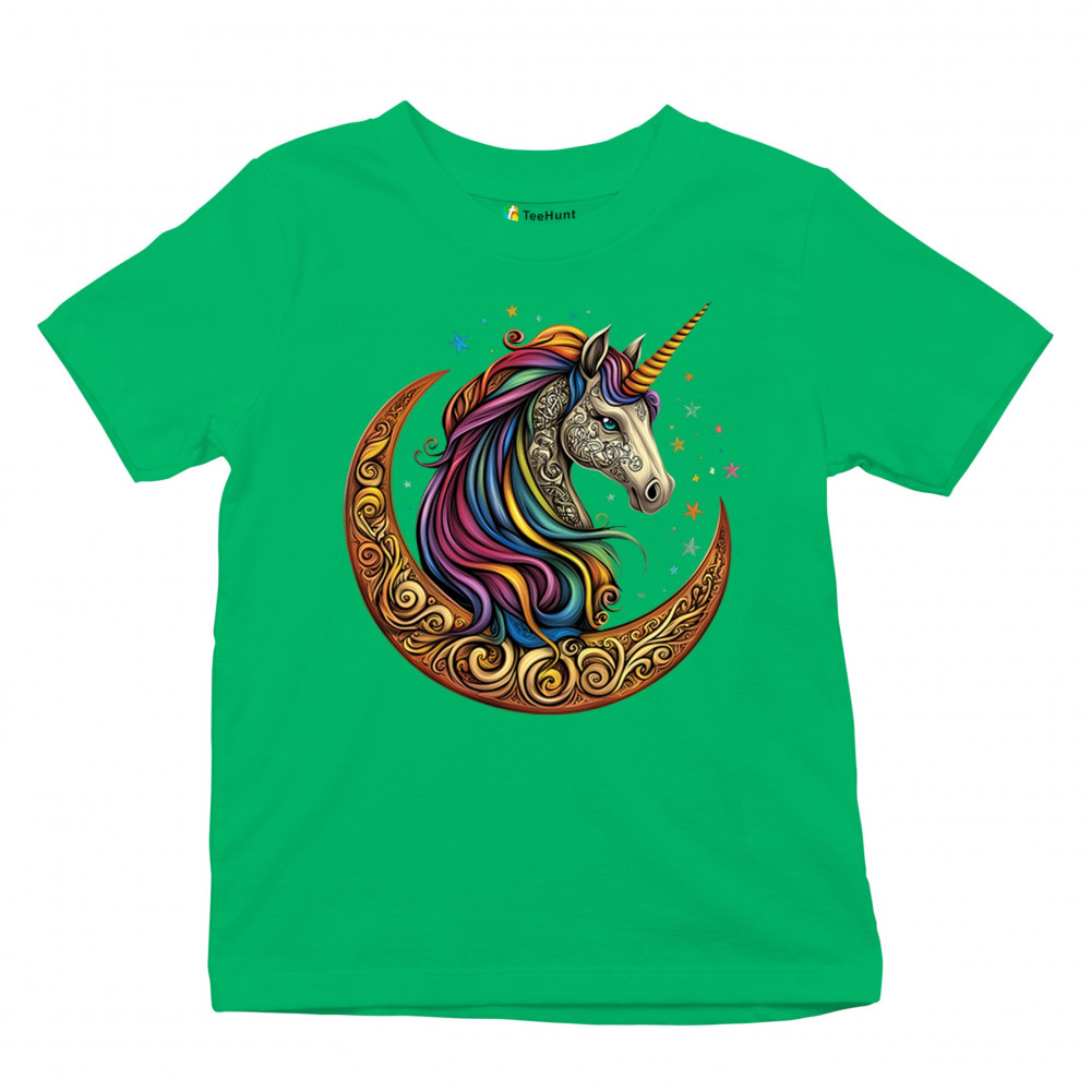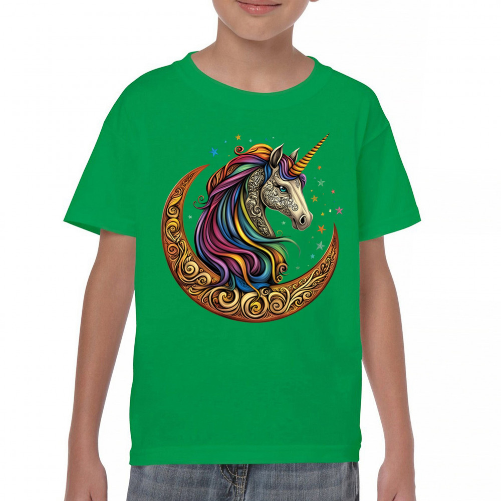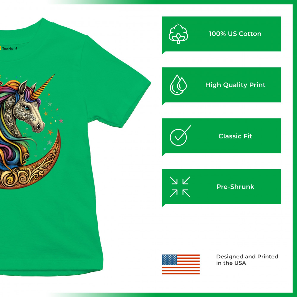 Rainbow-maned unicorn in golden Celtic moon design—perfect for fantasy lovers, dreamers, and unicorn fans who believe in magic and spirit.