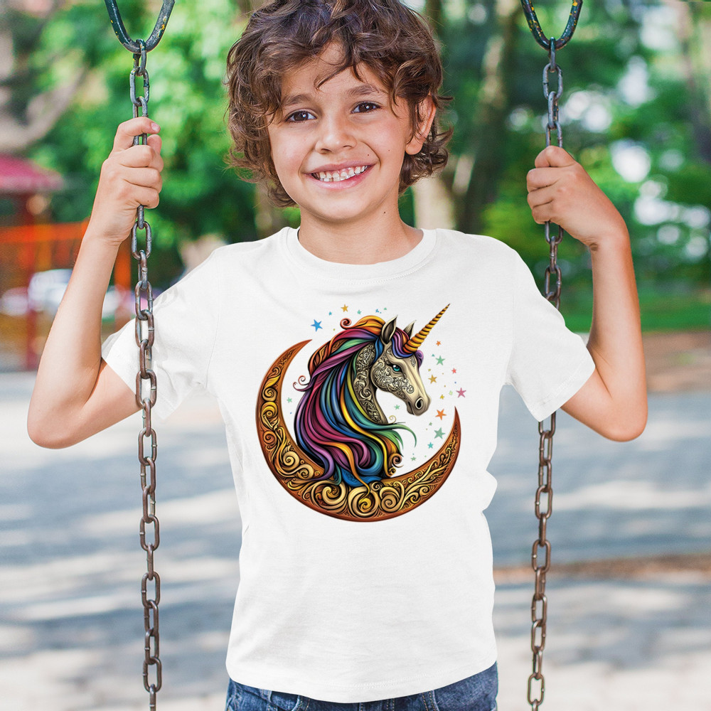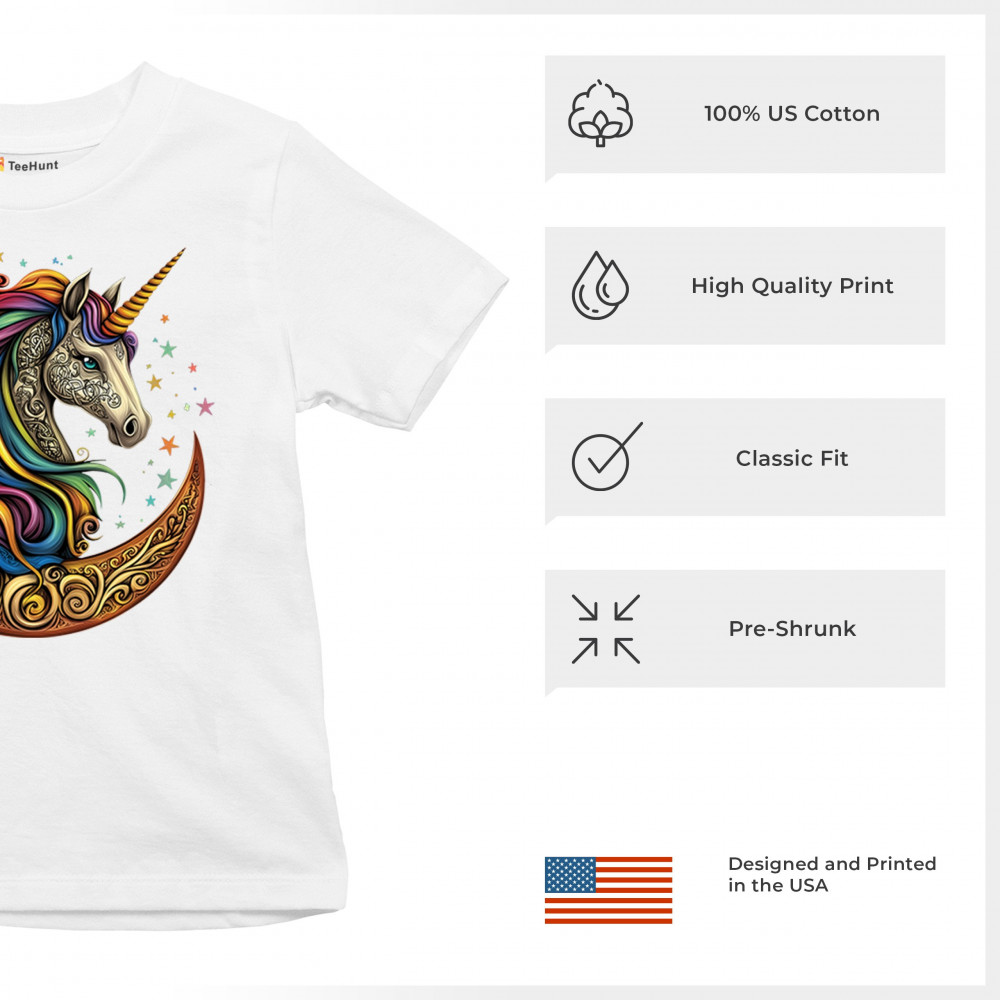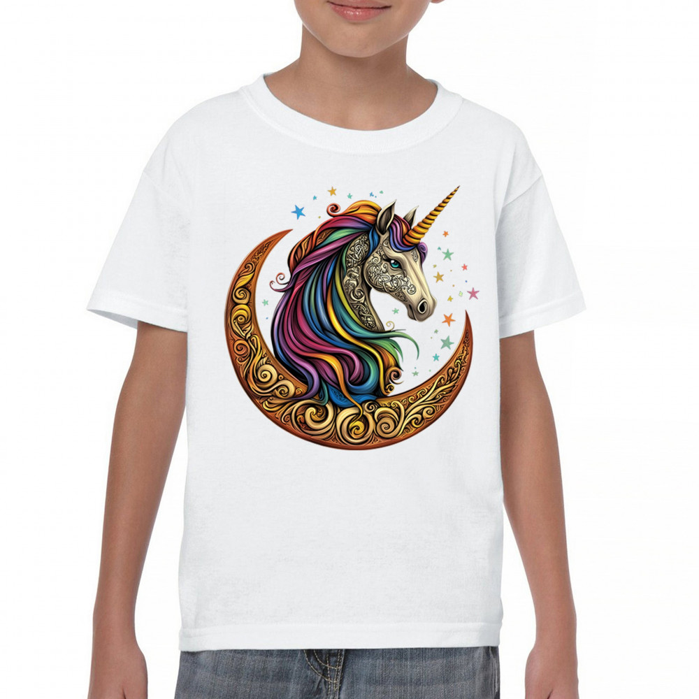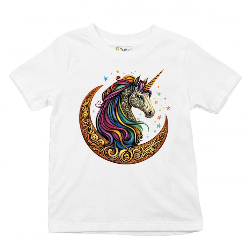 Rainbow-maned unicorn in golden Celtic moon design—perfect for fantasy lovers, dreamers, and unicorn fans who believe in magic and spirit.