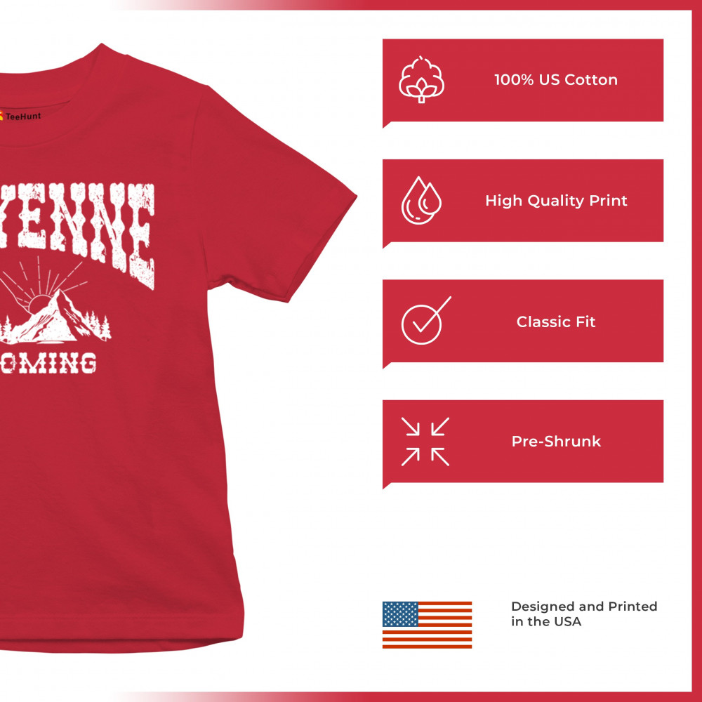 Vintage Cheyenne Wyoming design with mountain sunrise for outdoor lovers and locals. Perfect for travel, hiking, or Western pride.