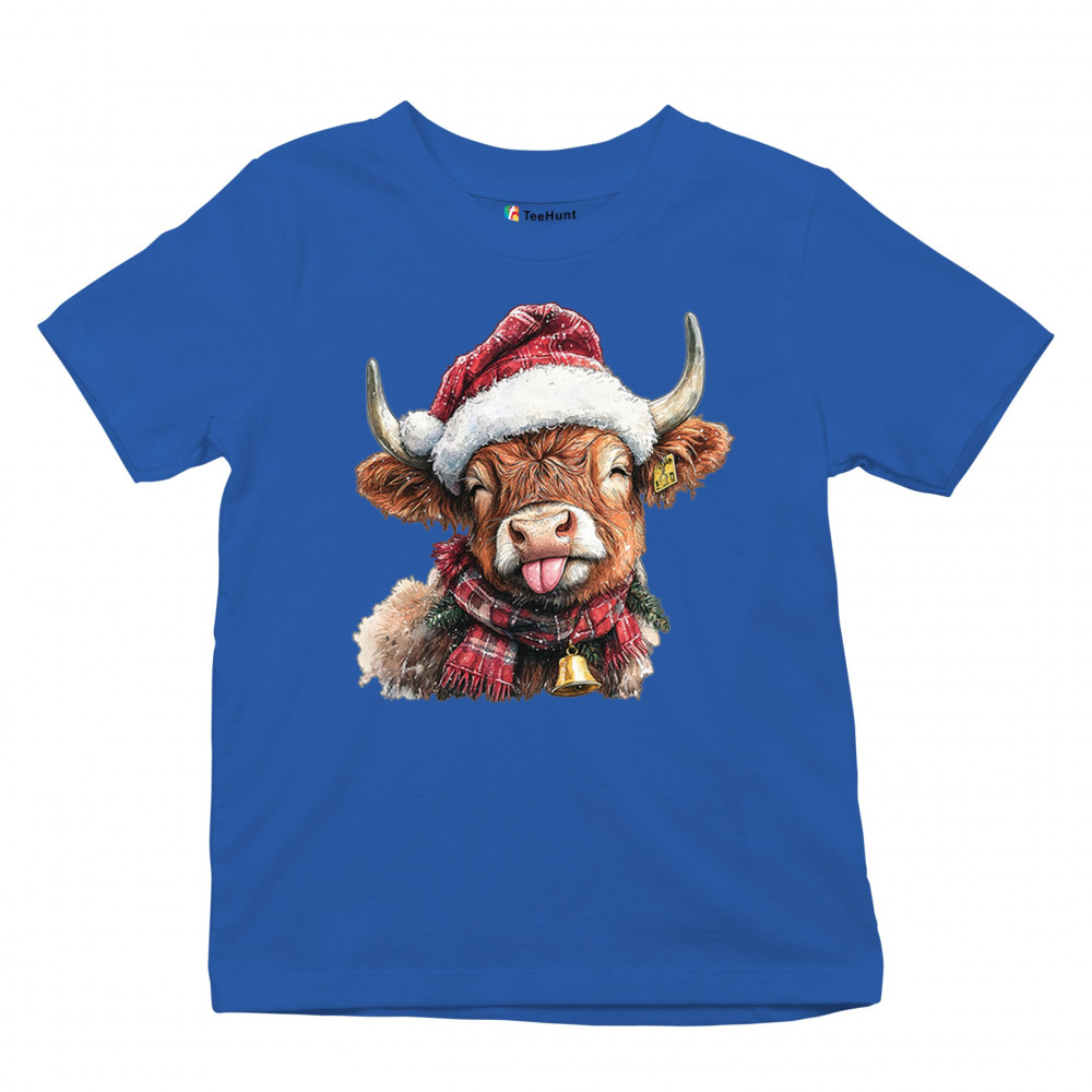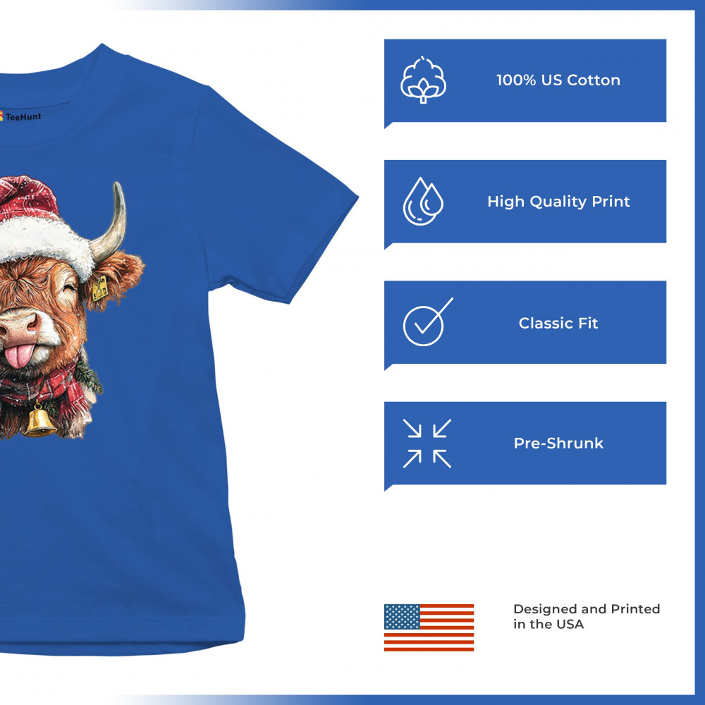 Christmas Highland Cow shirt – rustic holiday design with Santa hat cow, farmhouse holiday humor, country Christmas vibes, and festive livestock art.