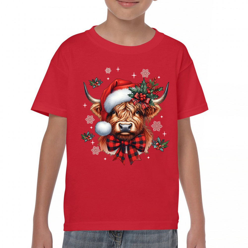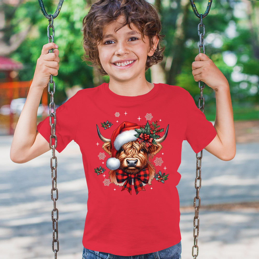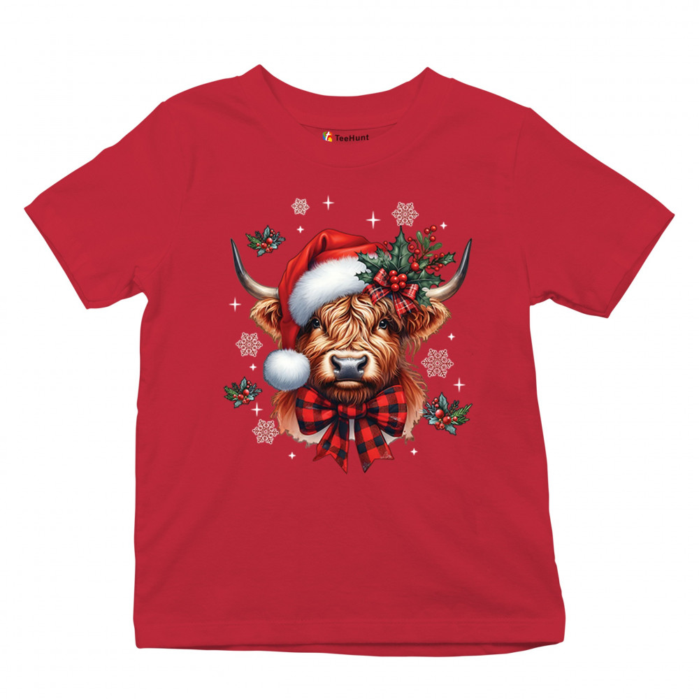 Festive Highland cow Christmas design with Santa hat, plaid bow, holly, and rustic farmhouse holiday charm. Perfect for cozy winter decor.