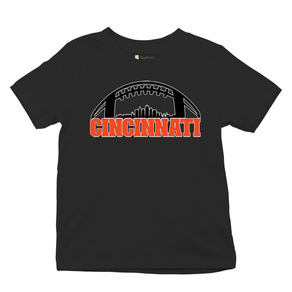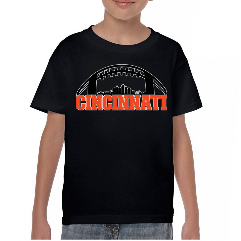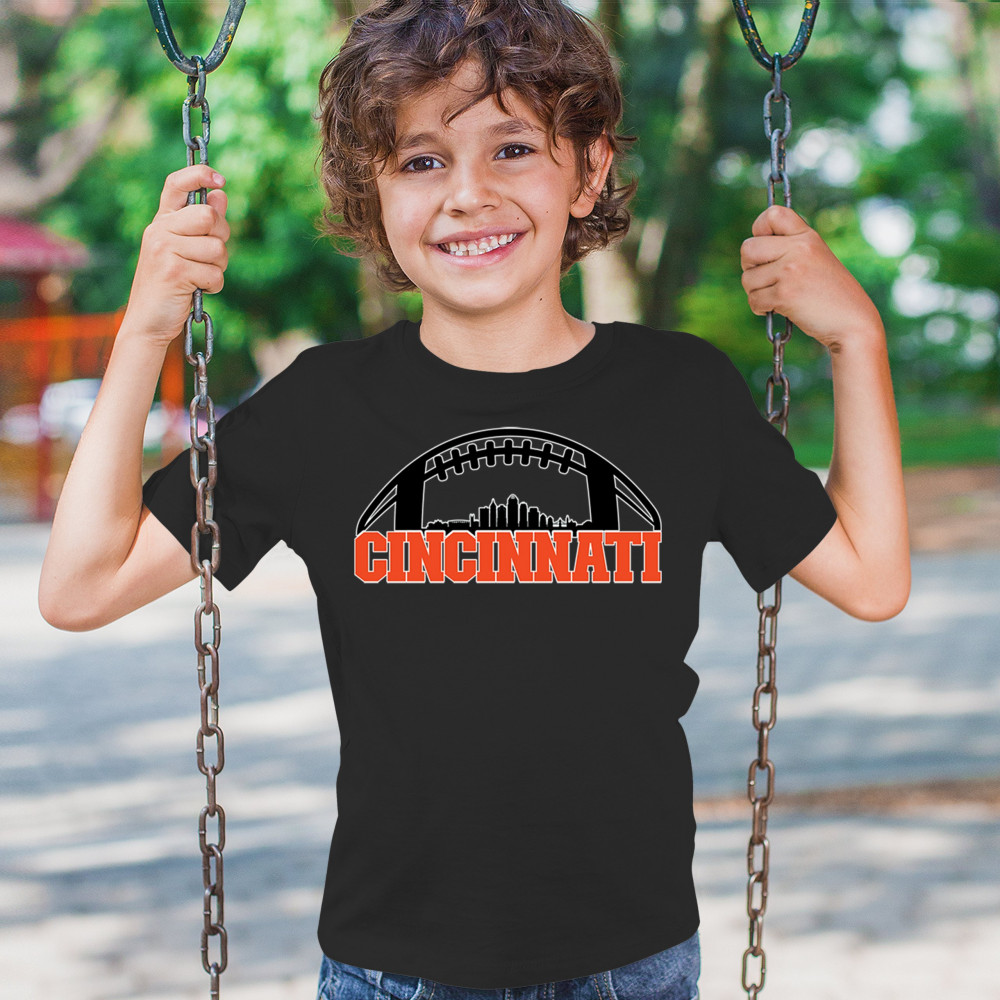 Celebrate Cincinnati and football with this bold skyline design under a football arch. Perfect for fans, tailgates, and game days!