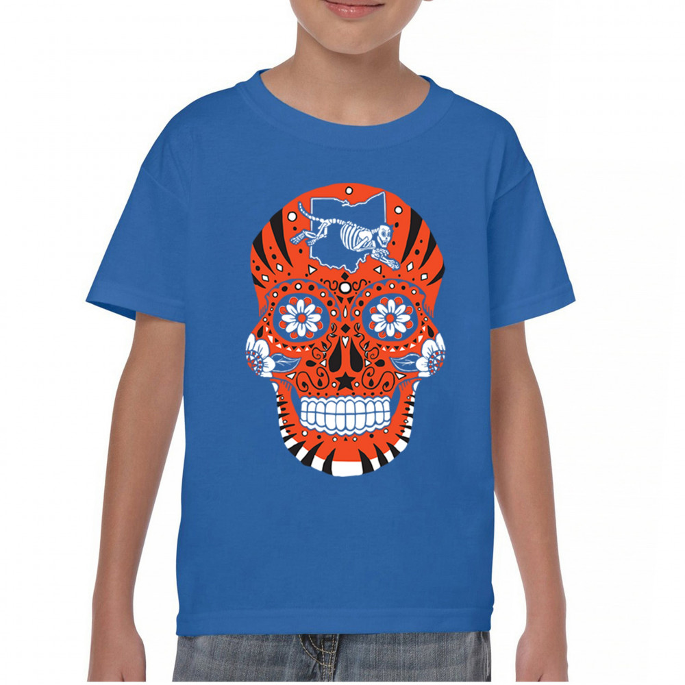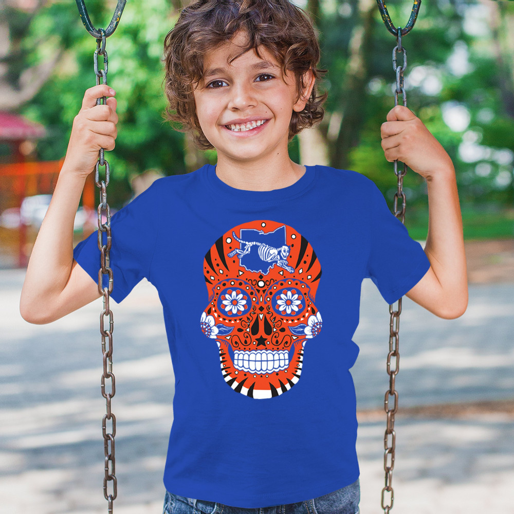 Cinci Sugar Skull with Queen City Paw, underdog grit, black & orange pride, Game Day energy, and playoff vibes.