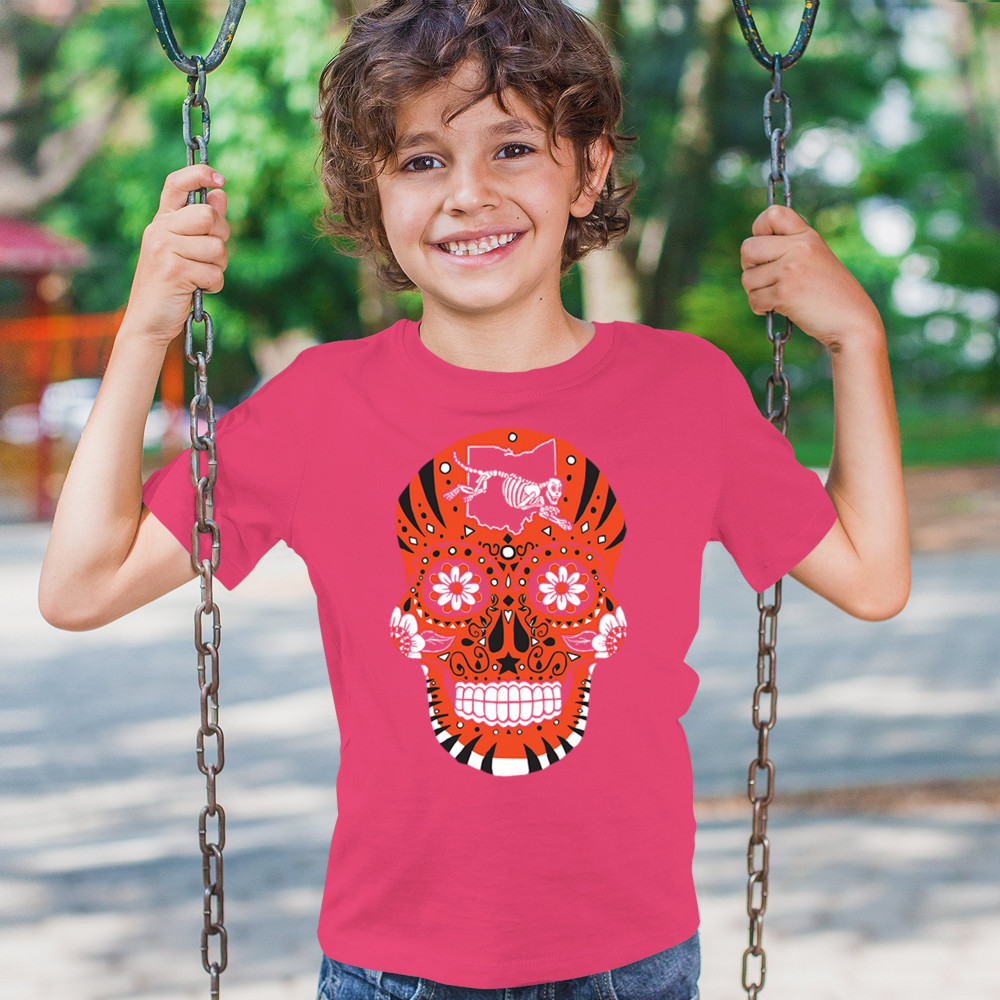 Cinci Sugar Skull with Queen City Paw, underdog grit, black & orange pride, Game Day energy, and playoff vibes.
