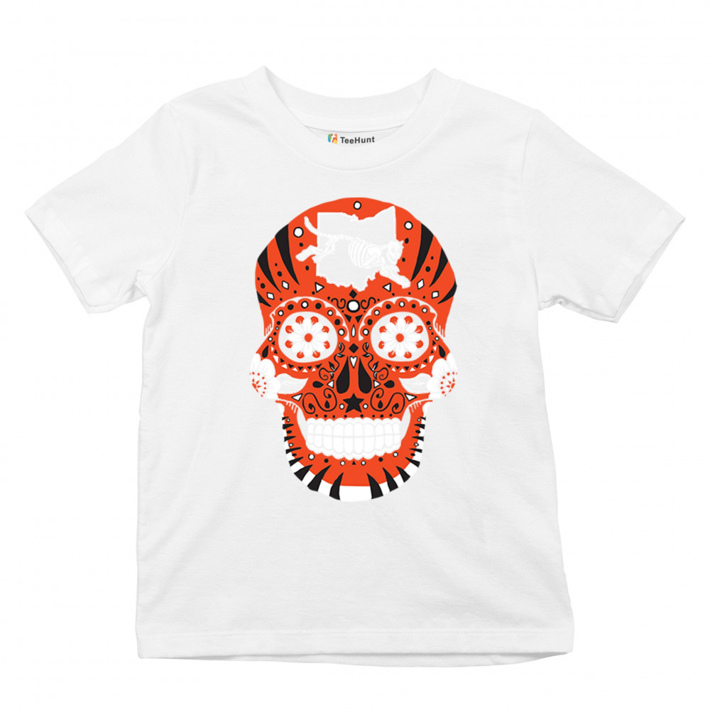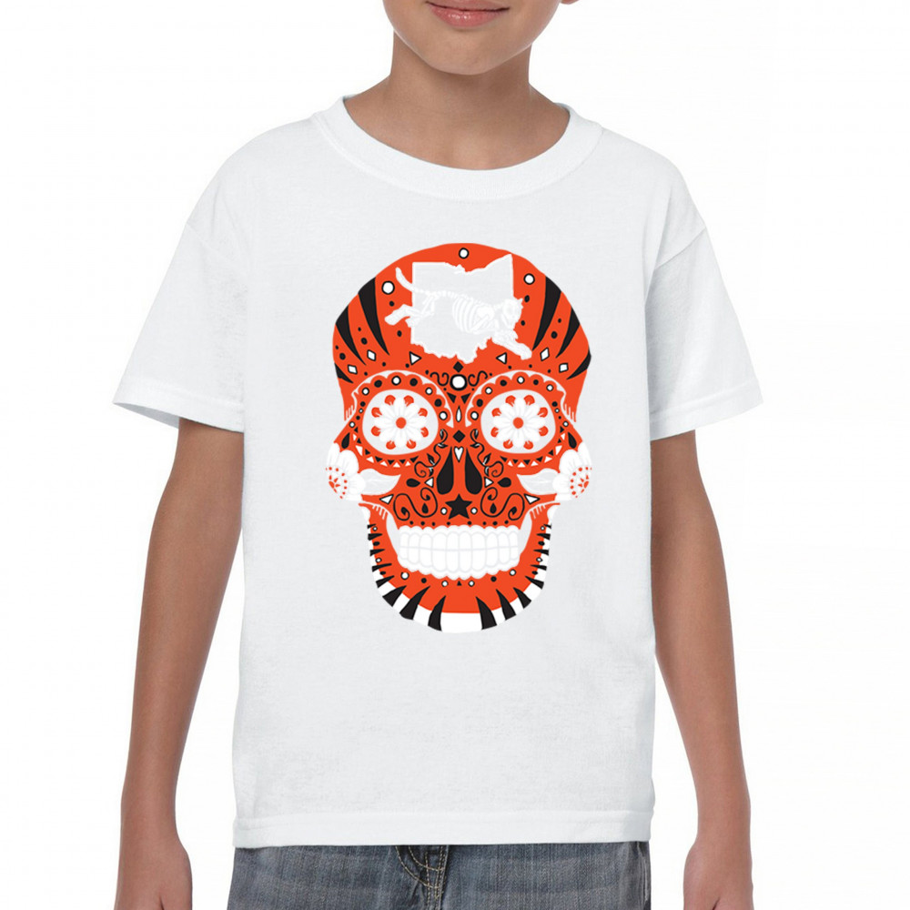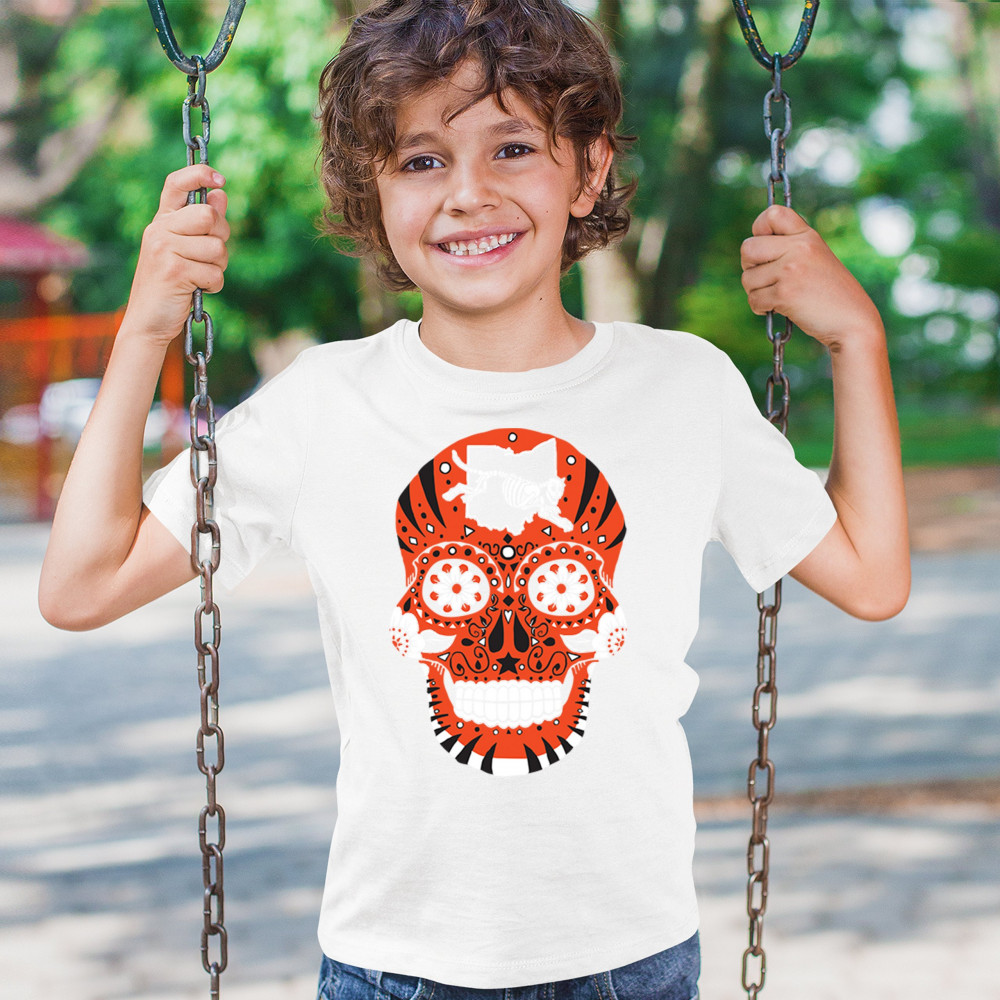 Cinci Sugar Skull with Queen City Paw, underdog grit, black & orange pride, Game Day energy, and playoff vibes.