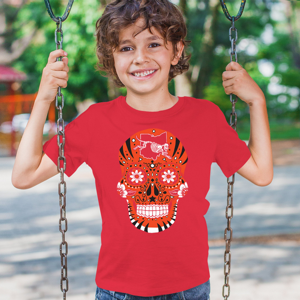 Cinci Sugar Skull with Queen City Paw, underdog grit, black & orange pride, Game Day energy, and playoff vibes.