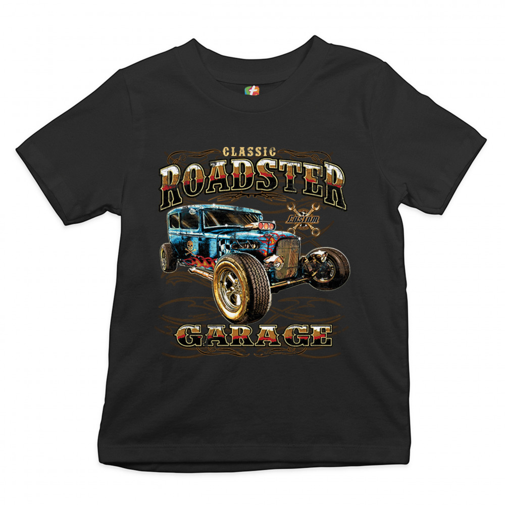 A print featuring a vintage-looking rat rod with flames and a skull with crossbones painted on it's side. "Classic Roadster" is written in the top and "Garage" in the bottom of the print. In the background there is a sign with crossed wrenches which says "custom". Great for Route 66 and hot rod fans.