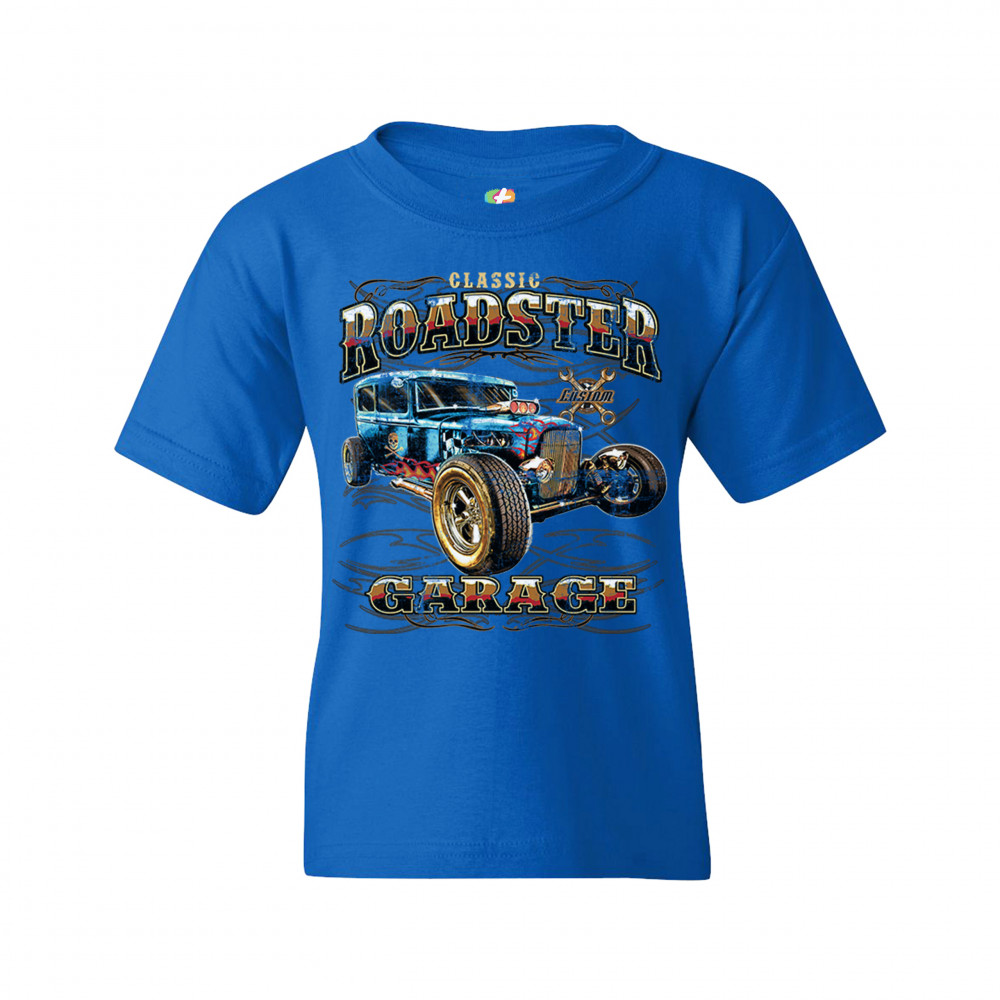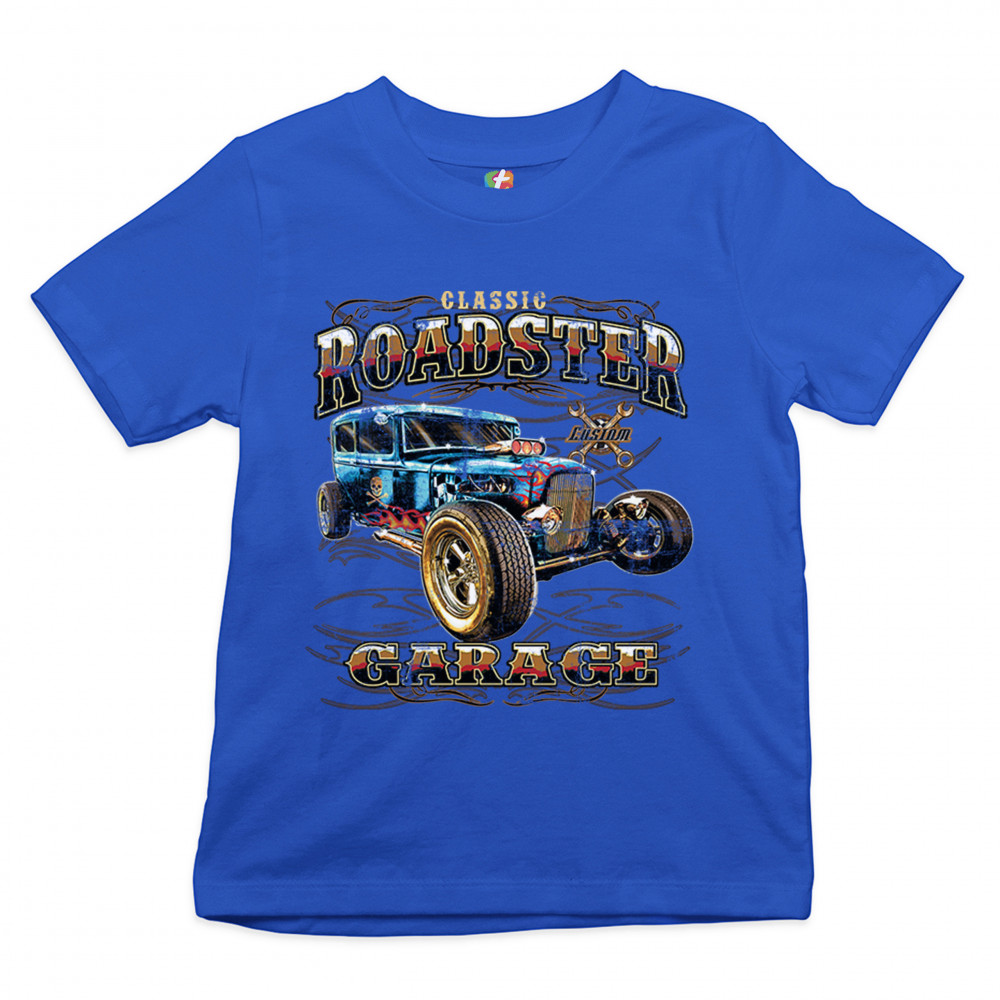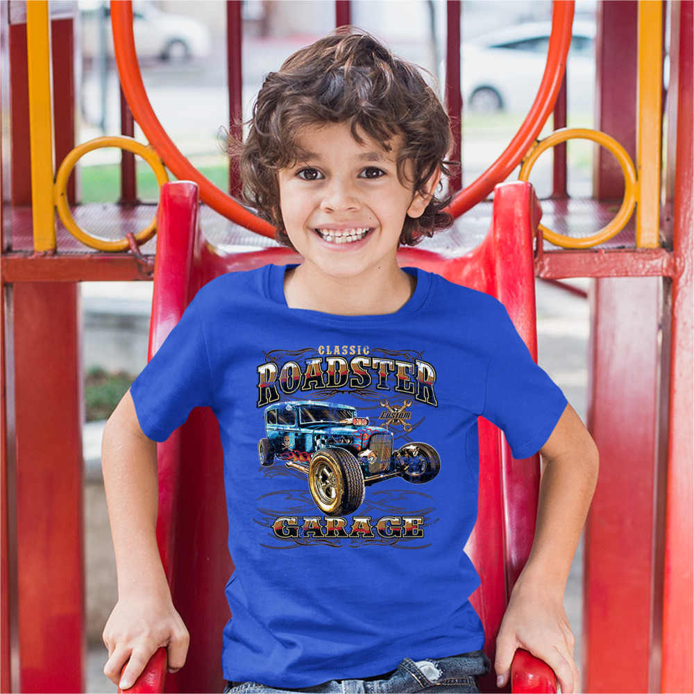 A print featuring a vintage-looking rat rod with flames and a skull with crossbones painted on it's side. "Classic Roadster" is written in the top and "Garage" in the bottom of the print. In the background there is a sign with crossed wrenches which says "custom". Great for Route 66 and hot rod fans.