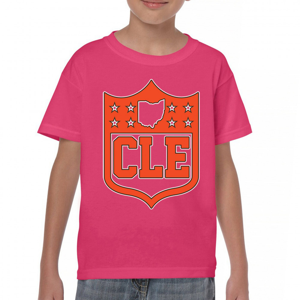 Bold CLE shield design honoring Cleveland football nation with Rust Belt pride, underdog grit, and blue collar sports heritage.